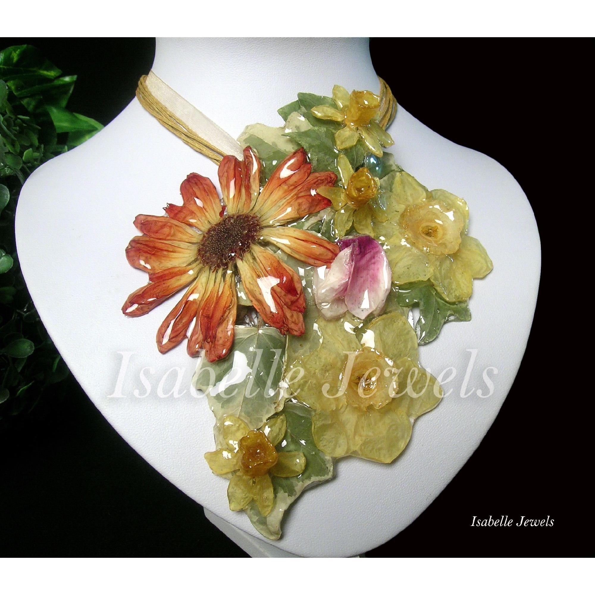 Collana realizzata a mano con fiori naturali: gerbera, narcisi di varie dimensioni ed un ciclamino disposti con edera variegata. Handmade real flowers necklace jewelry - Gioielli artigianali in resina epossidica con fiori veri, naturali, ed elementi botanici. Handmade real flowers, epoxy resin jewelry - MI TROVI ANCHE SU YouTube : @isabellejewels