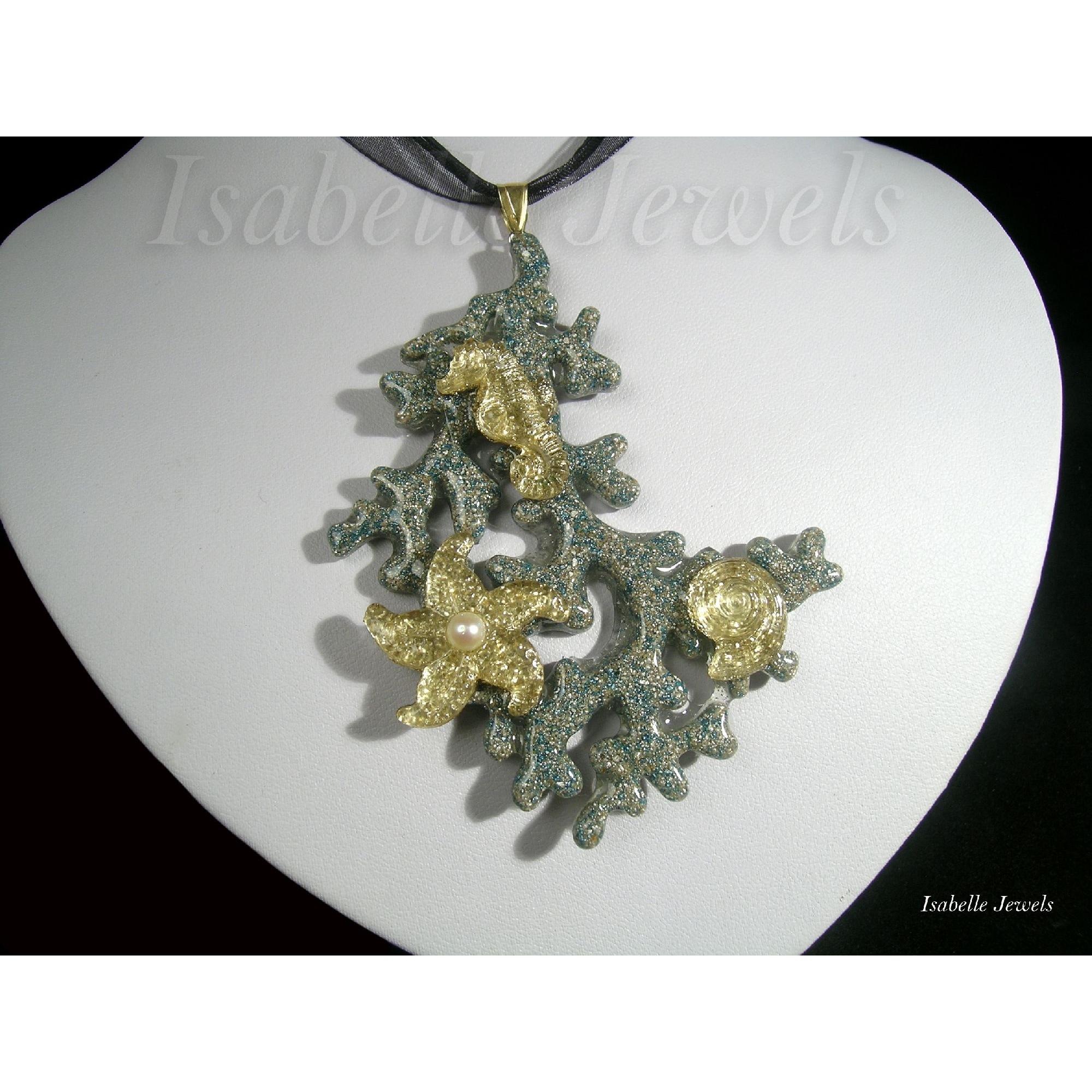 Collana colorata a tema marino, realizzata in resina con sabbia vetrificata, foglia oro 22 carati ed una perla naturale di mare, contromaglia in argento 925. Handmade sea resin necklace - Gioielli artigianali in resina epossidica, creazioni uniche. Handmade real flowers, epoxy resin jewelry - MI TROVI ANCHE SU YouTube : @isabellejewels
