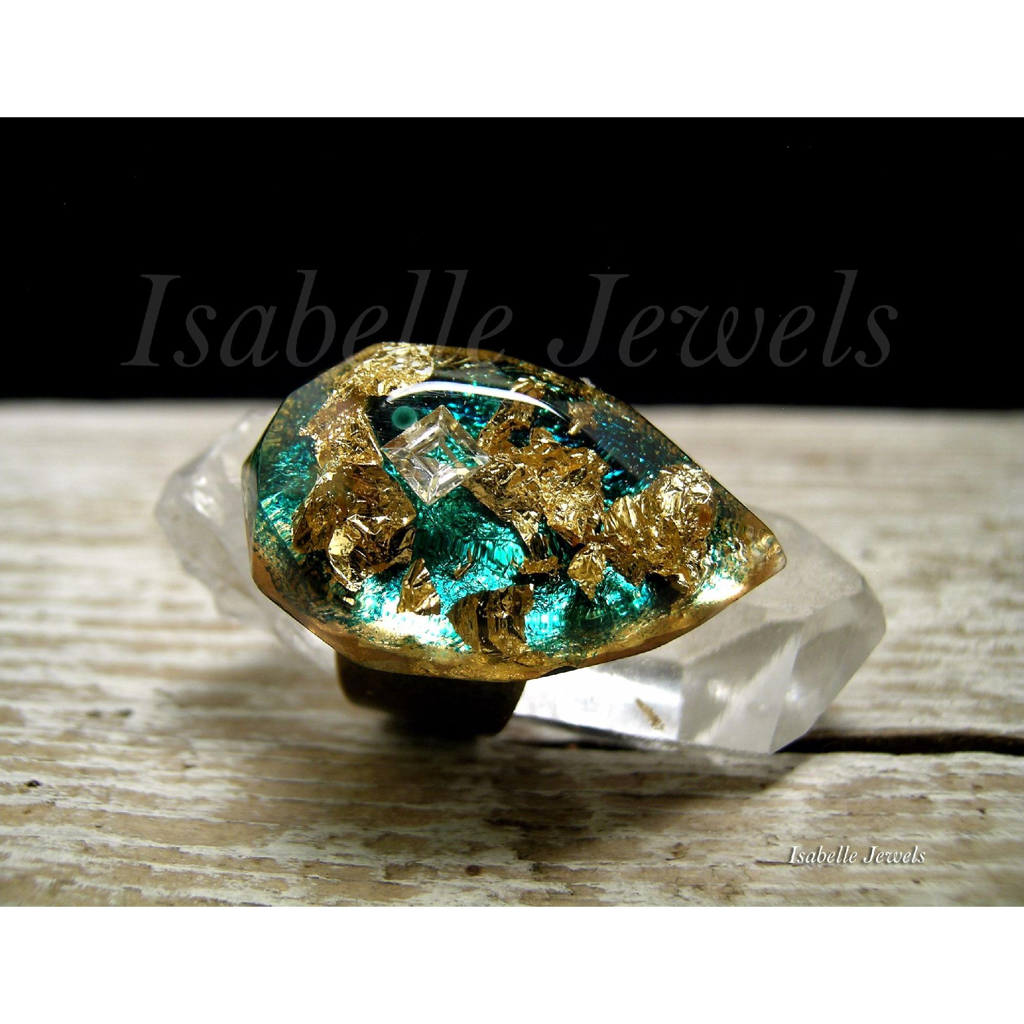 Anello artigianale realizzato in resina trasparente con foglia oro 22 carati e zircone, base regolabile in metallo brunito, gioielli artigianali in resina epossidica. Handmade epoxy resin, gold leaf gemstone ring - - MI TROVI ANCHE SU YouTube : @isabellejewels