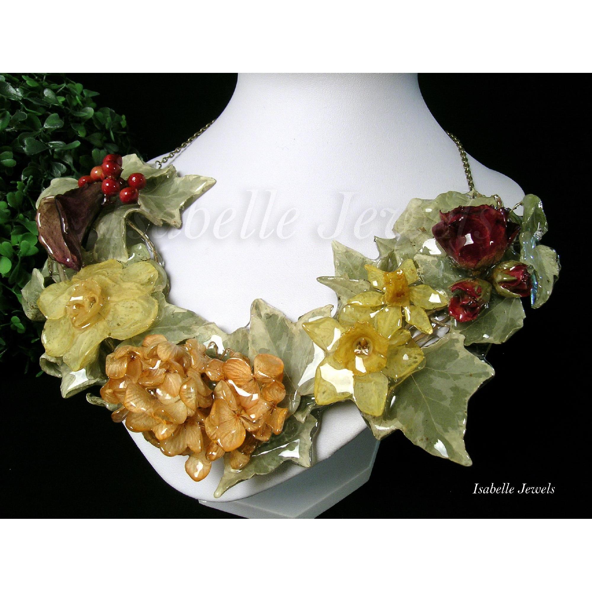 Collana girocollo donna realizzata a mano con edera, una rosellina, due boccioli di rosa, tre narcisi, ortensia calla e bacche. Montatura in metallo brunito. Gioielli artigianali in resina epossidica con fiori veri, naturali, ed elementi botanici. Handmade real flowers, epoxy resin necklace - MI TROVI ANCHE SU YouTube : @isabellejewels