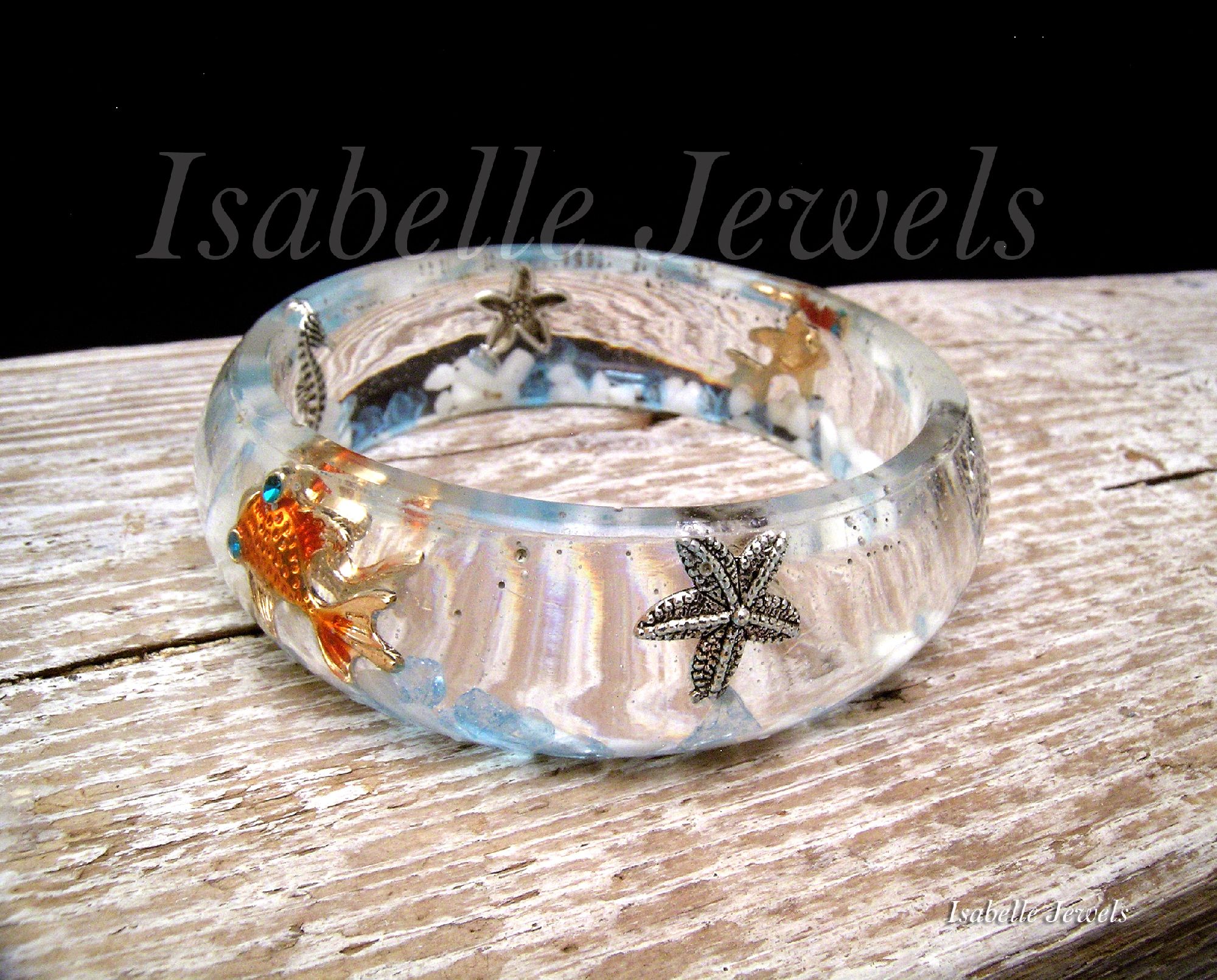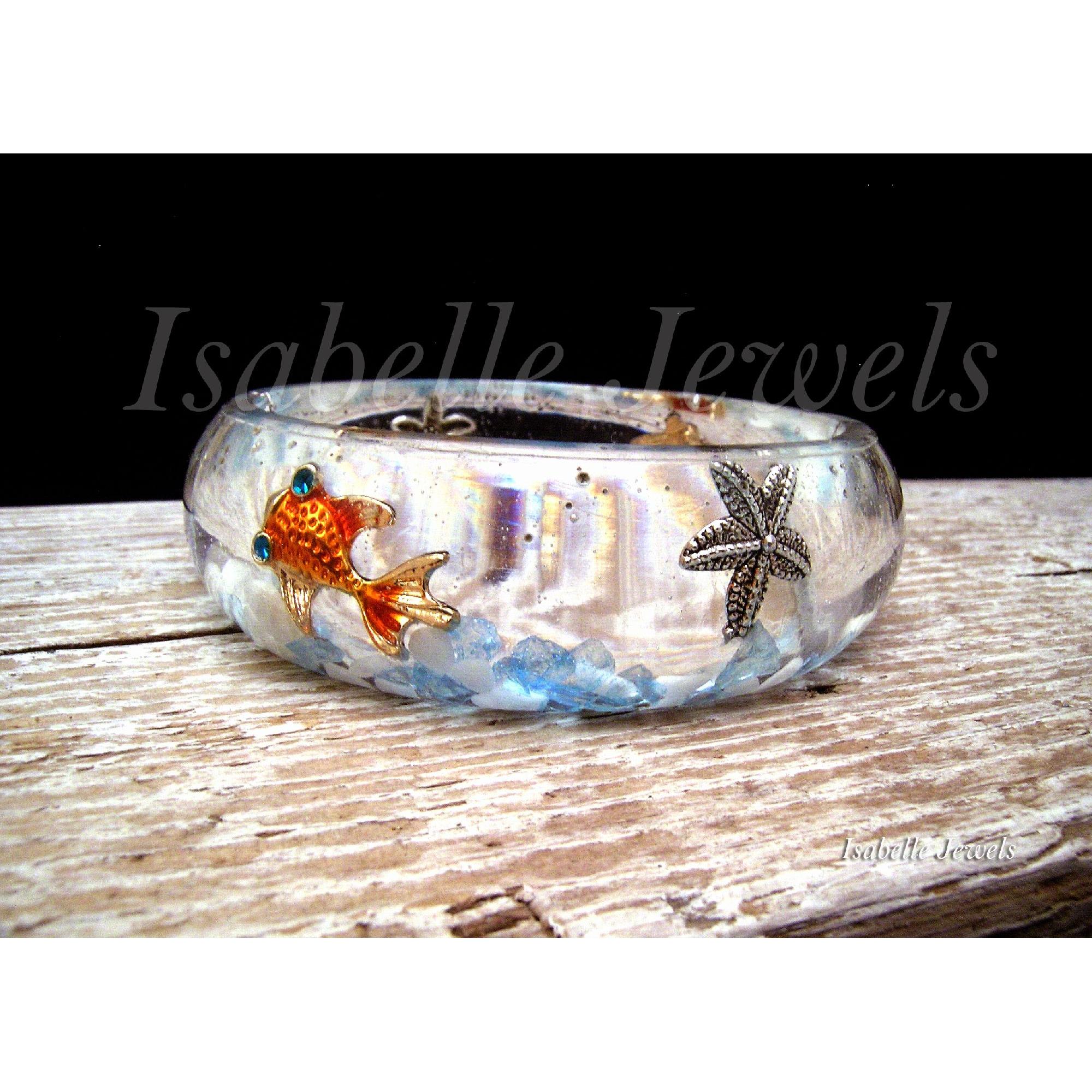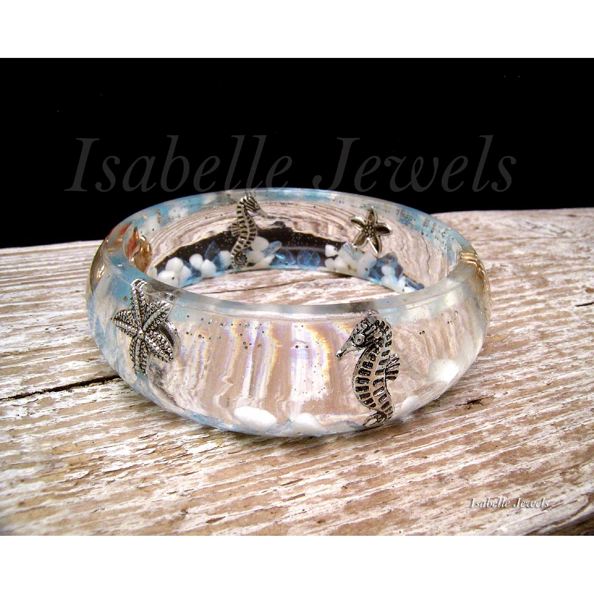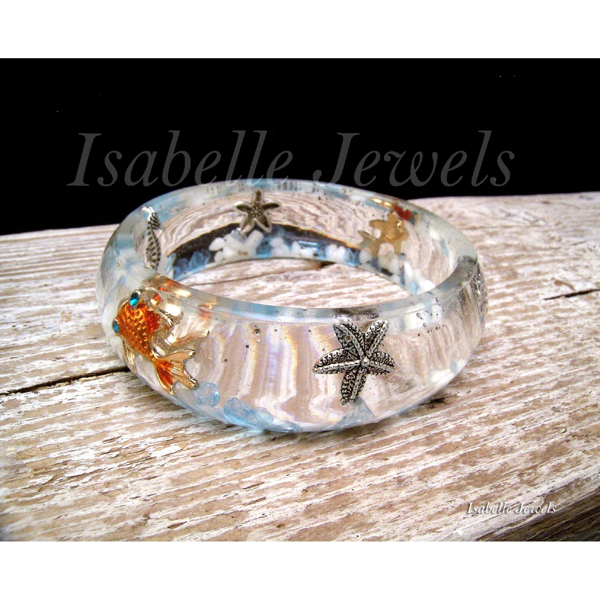 Bracciale rigido realizzato in resina epossidica a tema marino. Handmade sea resin bracelet, aquarium diorama jewelry