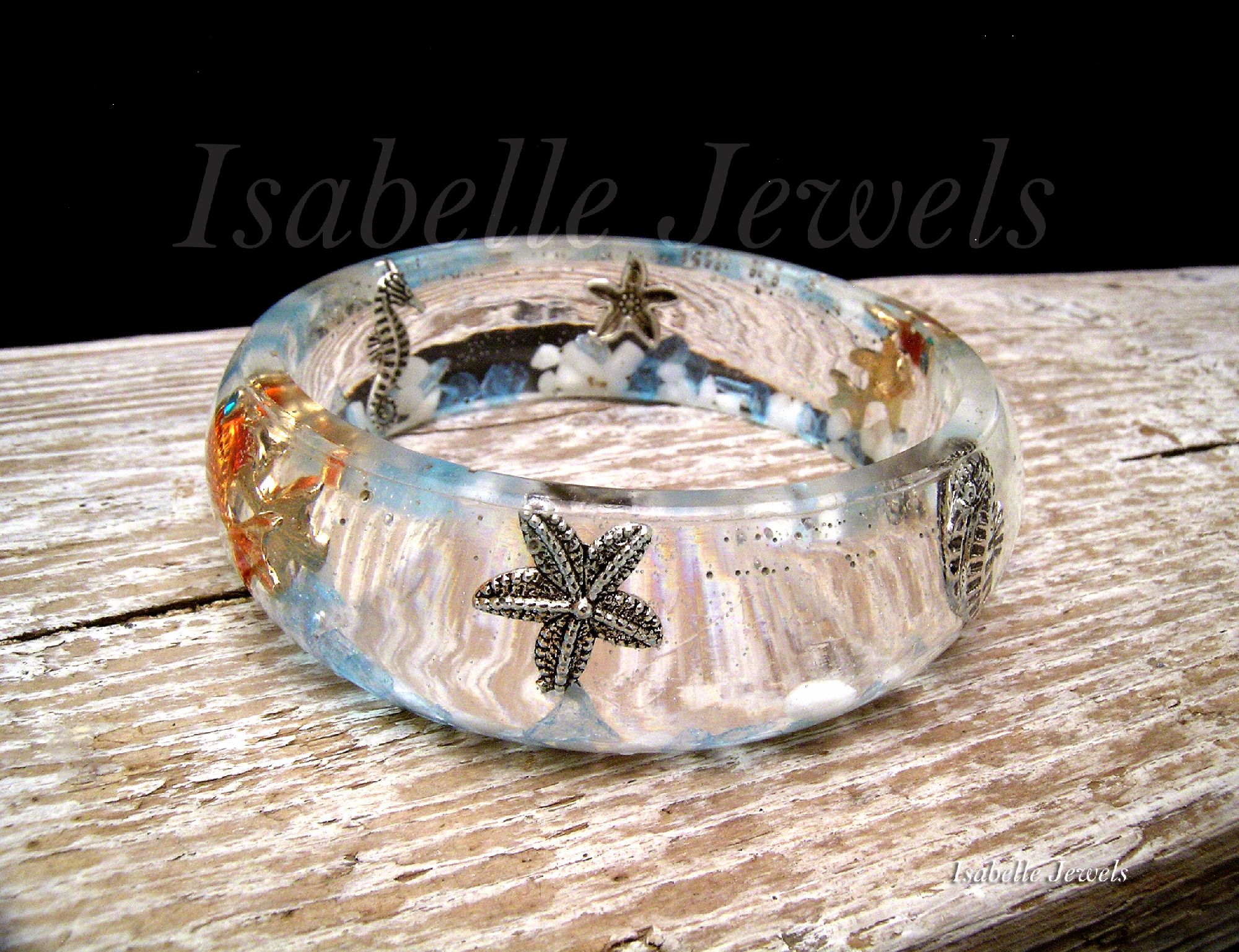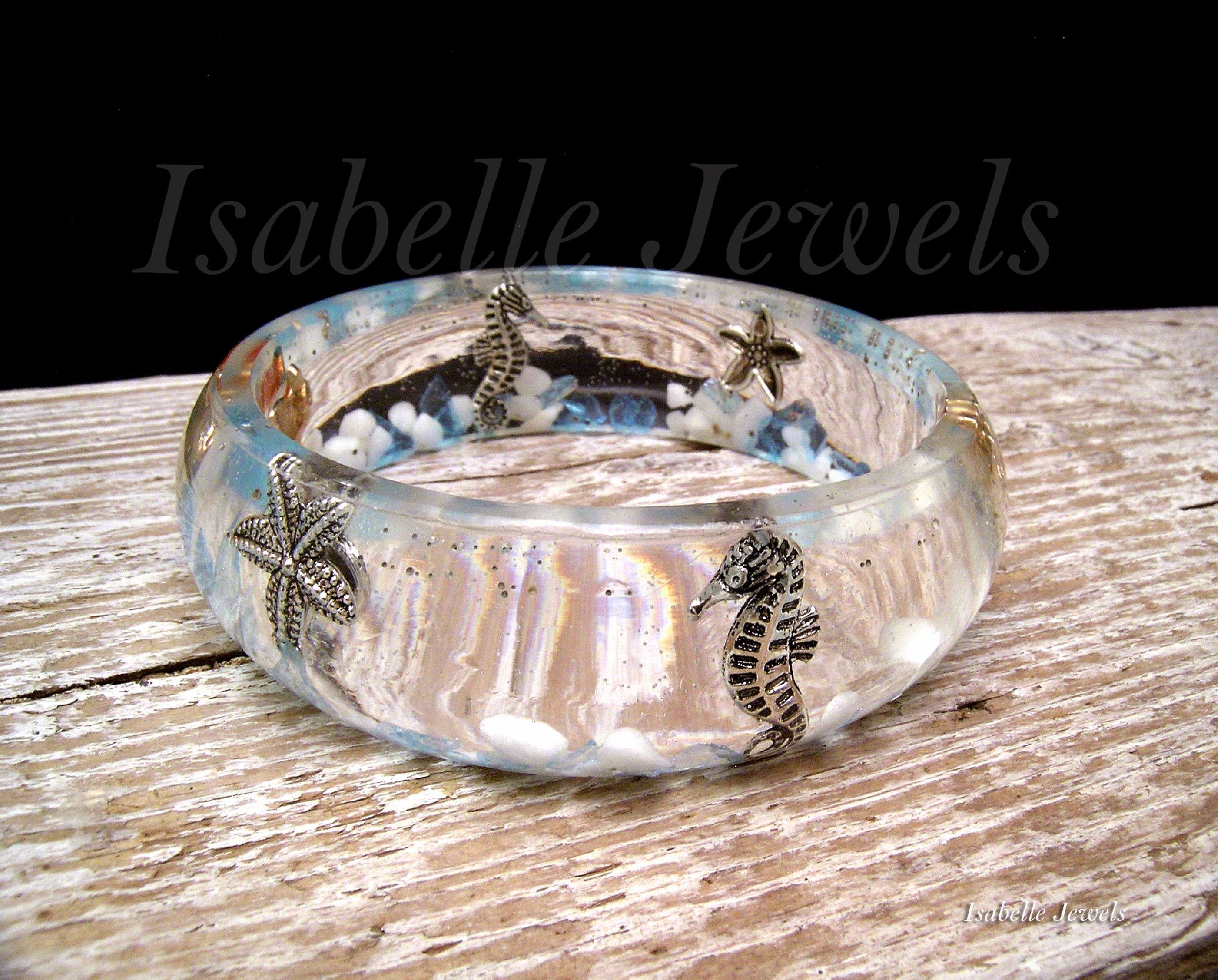 Bracciale rigido realizzato a mano in resina epossidica a tema marino, con quarzi azzurri, sassolini ed elementi in metallo. Aquarium epoxy Resin bracelet - Gioielli artigianali in resina epossidica, creazioni uniche. Handmade epoxy resin jewelry - MI TROVI ANCHE SU YouTube : @isabellejewels