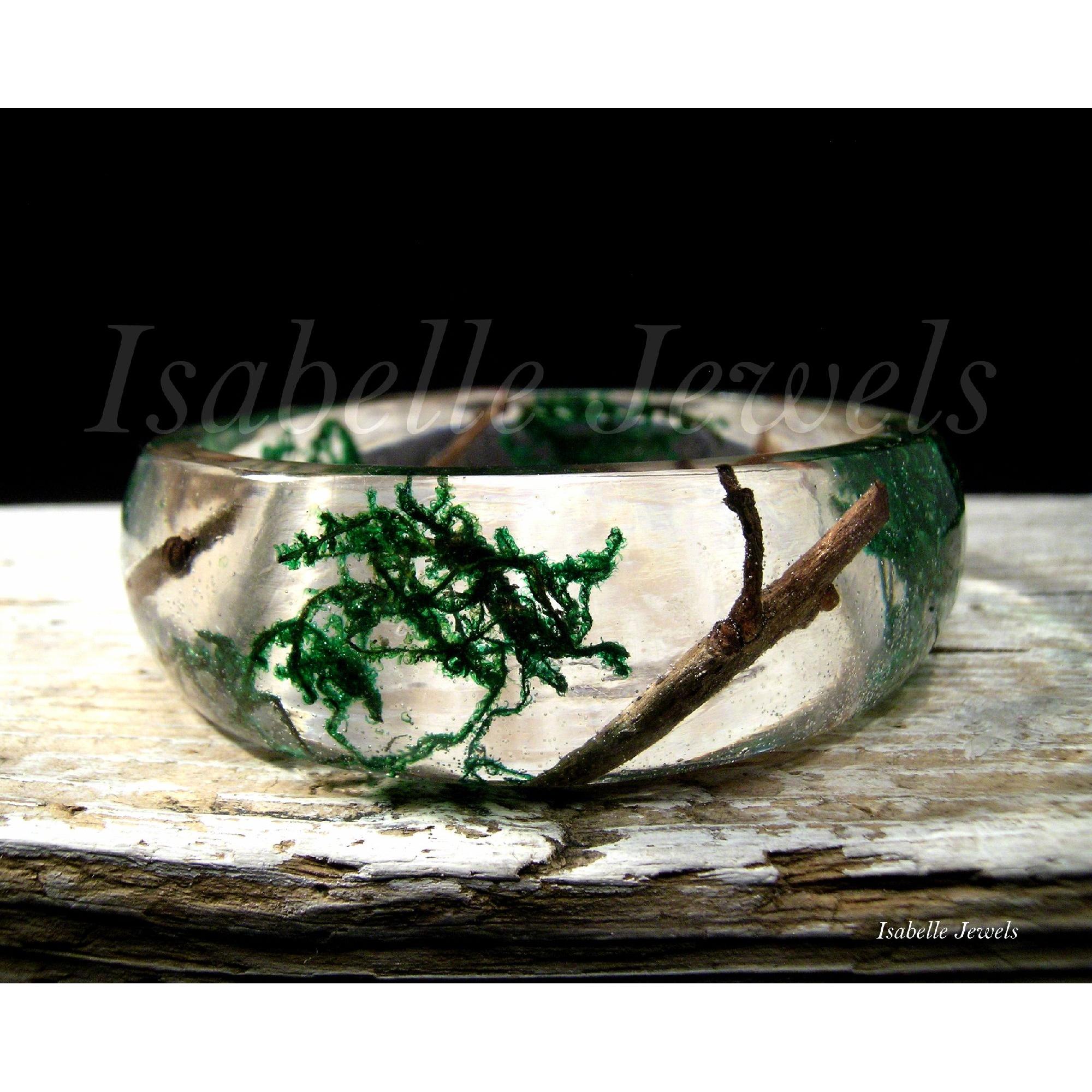 Bracciale rigido realizzato in resina con muschio e rametti, gioielli donna. Handmade resin botanical terranium bracelet, Artistic jewelry, Gioielli artistici