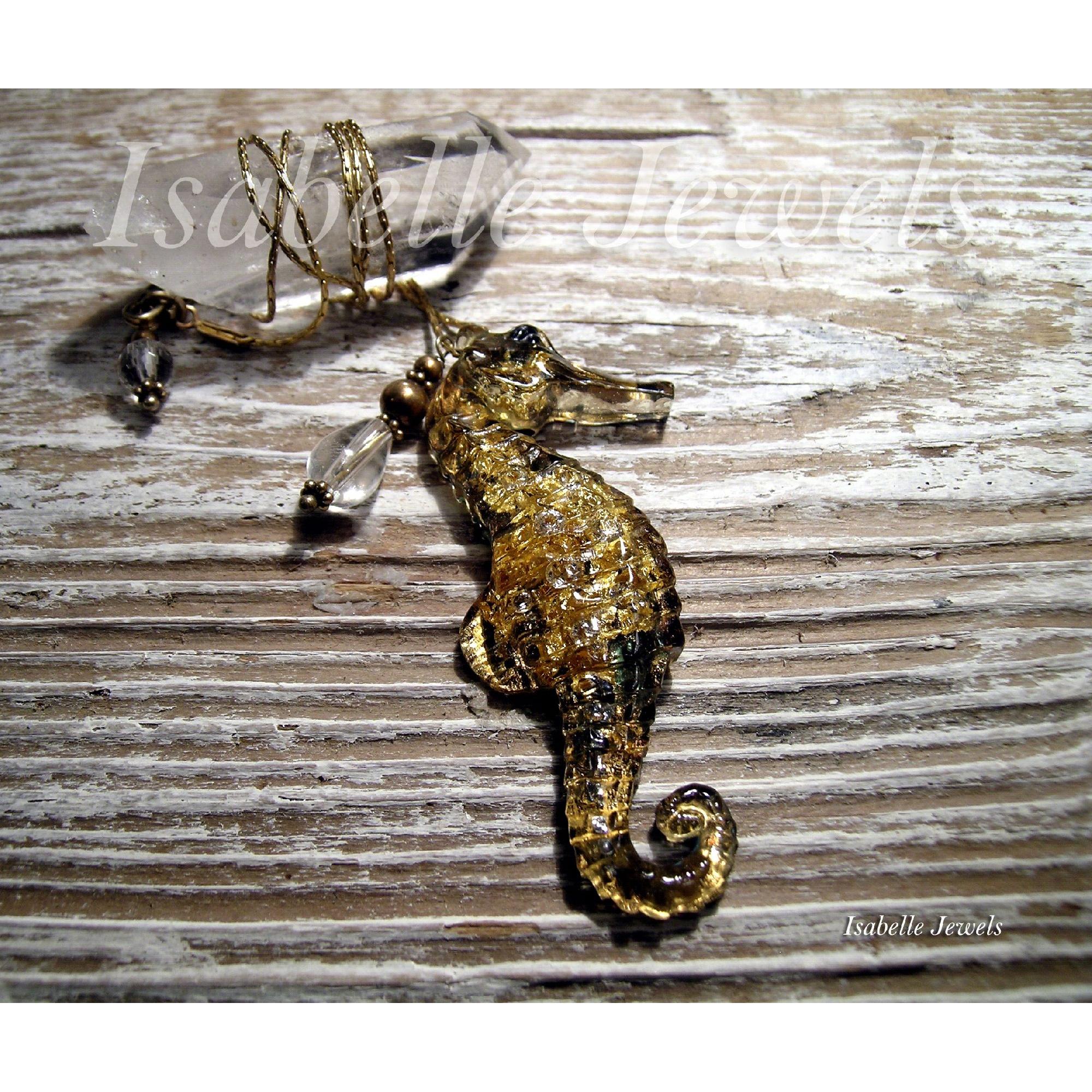 Collana cavalluccio marino, realizzata a mano in resina con pietre e foglia oro. Handmade seahorse epoxy resin, gemstones necklace