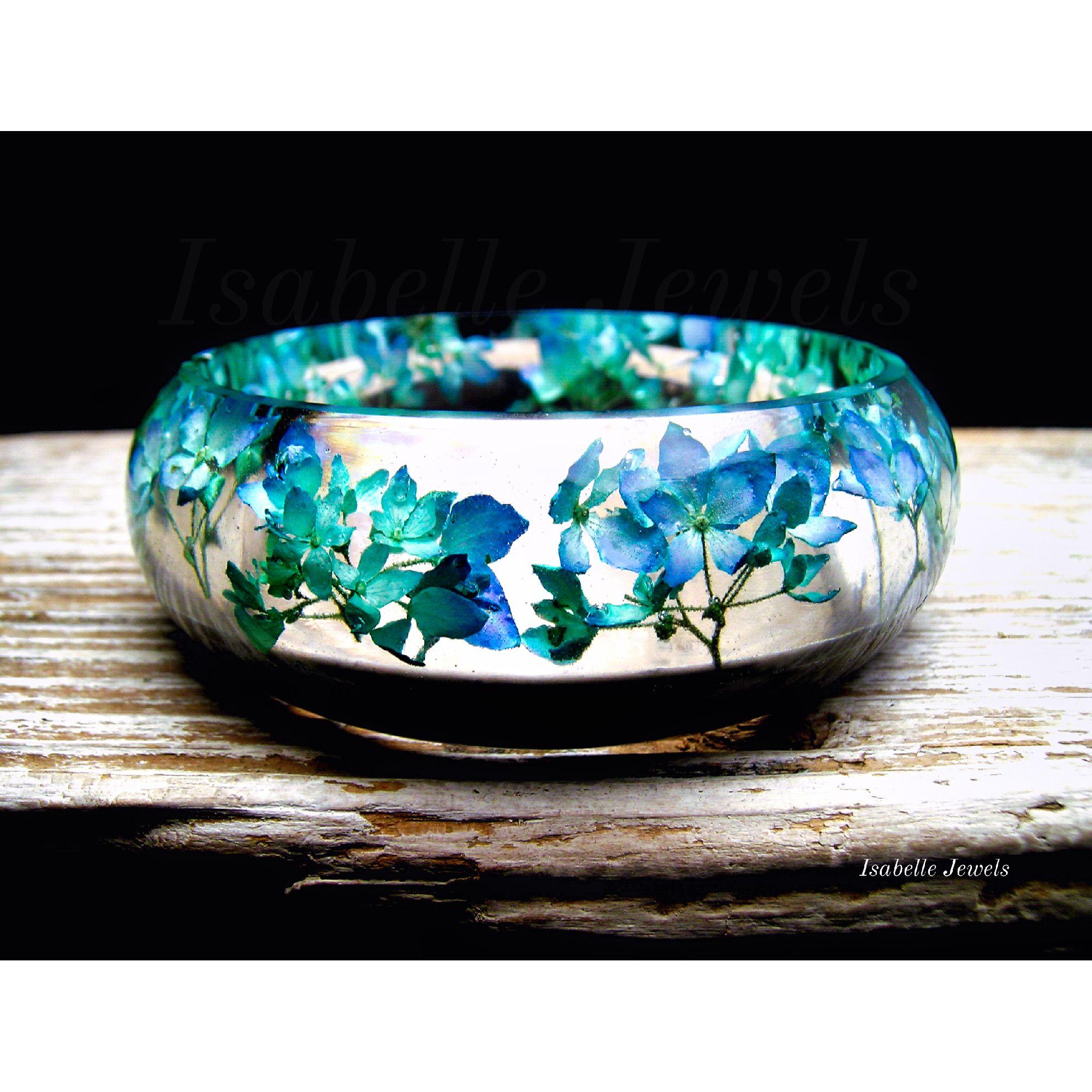 ~ Bracciale rigido realizzato a mano con fiori di ortensia blu, cristallizzati nella resina
