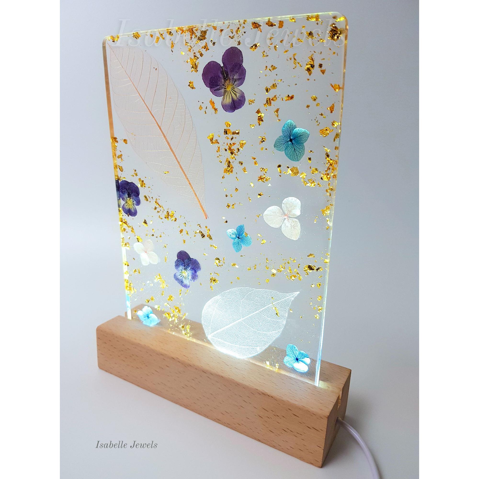 ~ Lampada da comodino artigianale, realizzata in resina con fiori veri e foglia oro