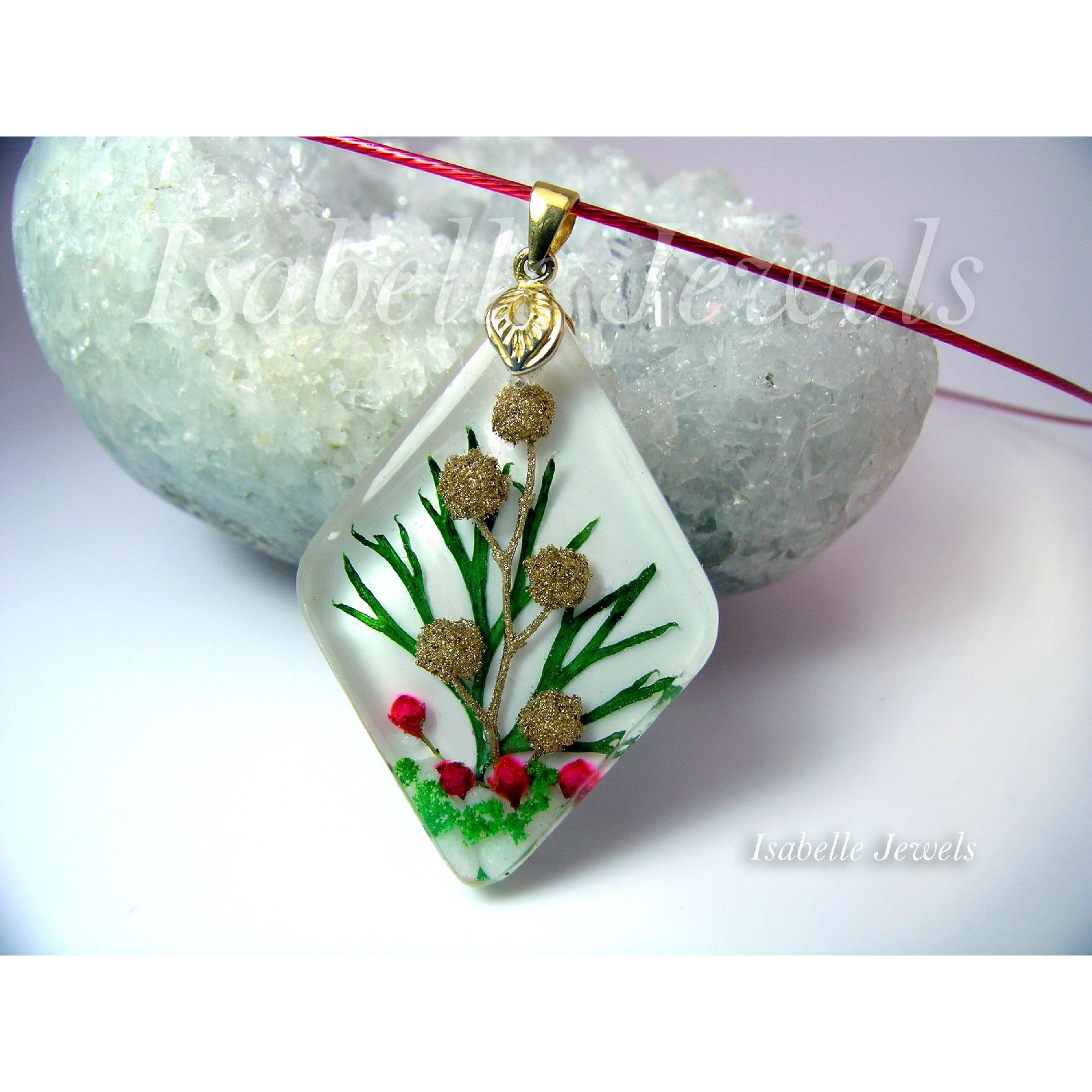 Gioielli artigianali realizzati con fiori veri naturali ed elementi botanici, cristallizzati nella resina.