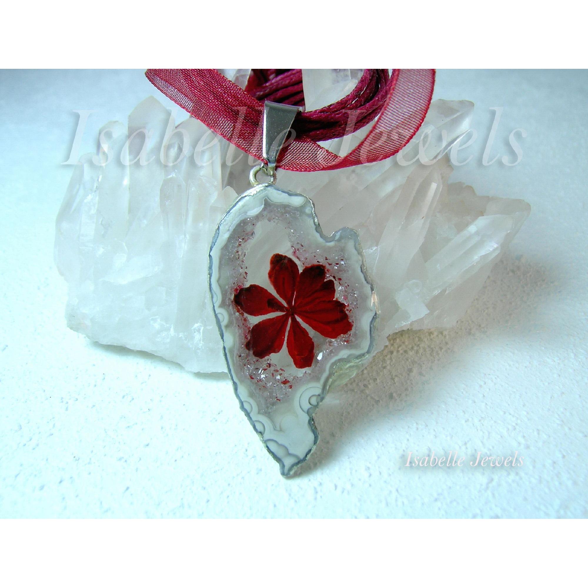 Collana Artigianale con vero fiore di ortensia rossa, cristallizzata nell'agata naturale