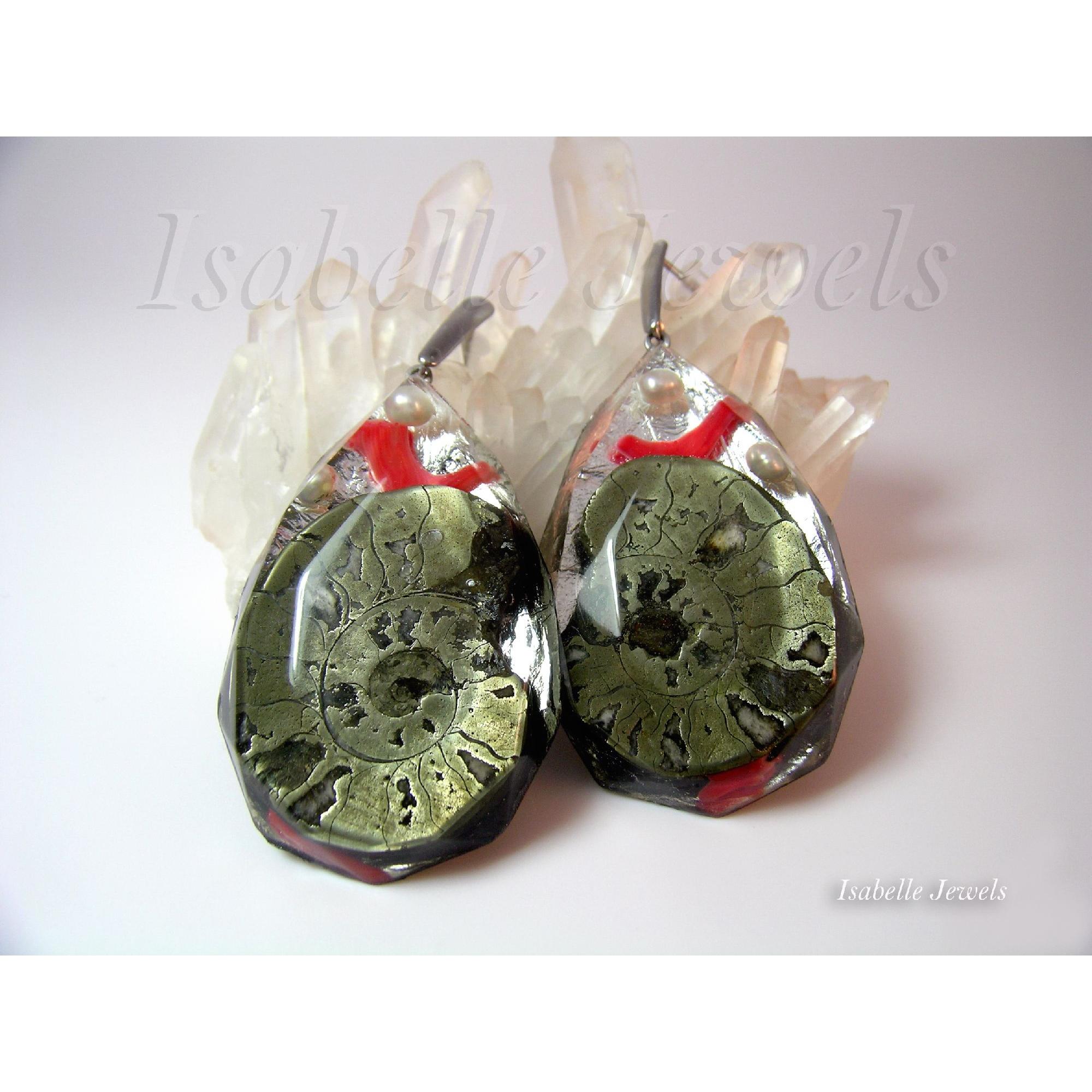 ~ Orecchini donna, realizzati con fossili di ammoniti, perle naturali e coralli