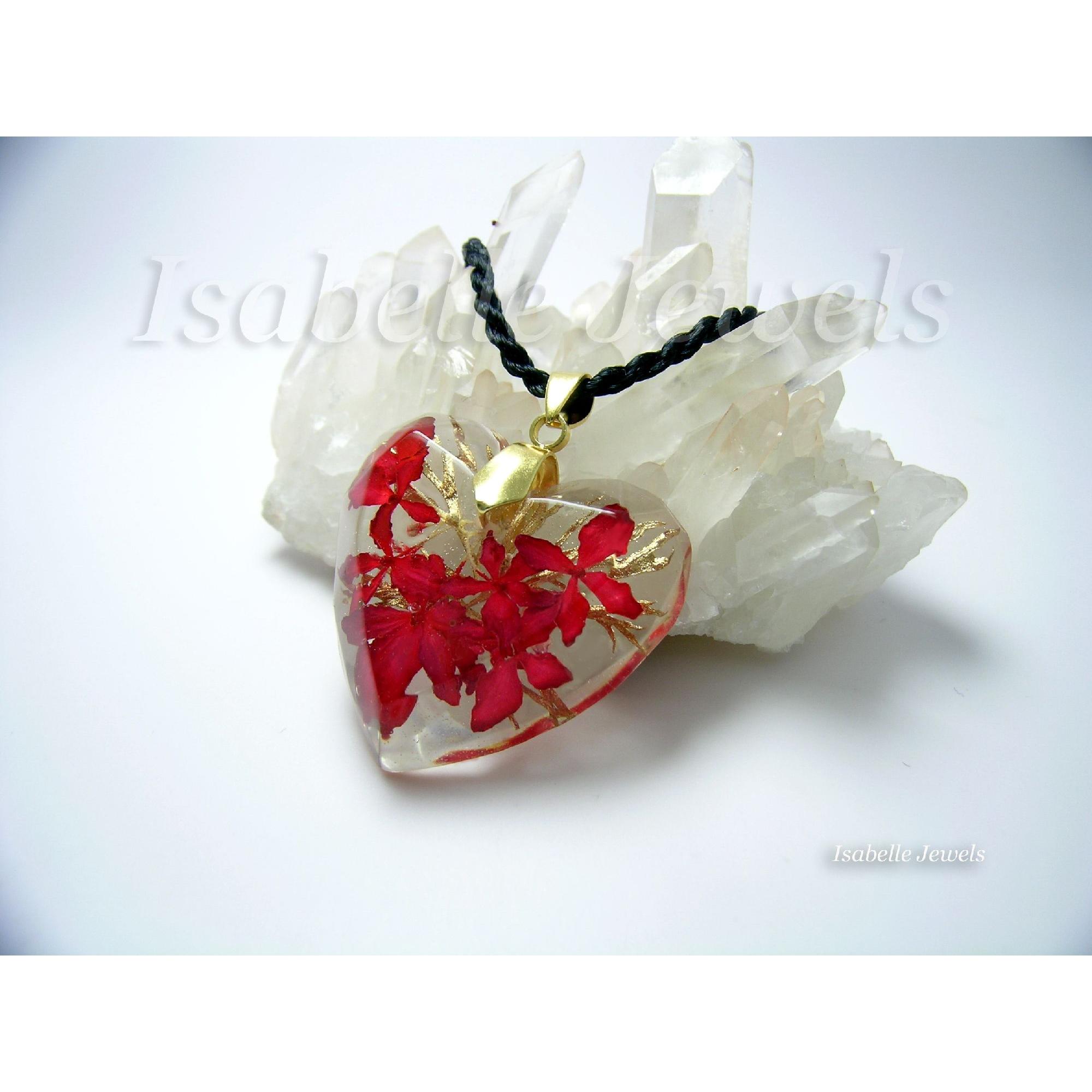 Collana a cuore realizzata in resina con fiori rossi ed elementi botanici dorati.