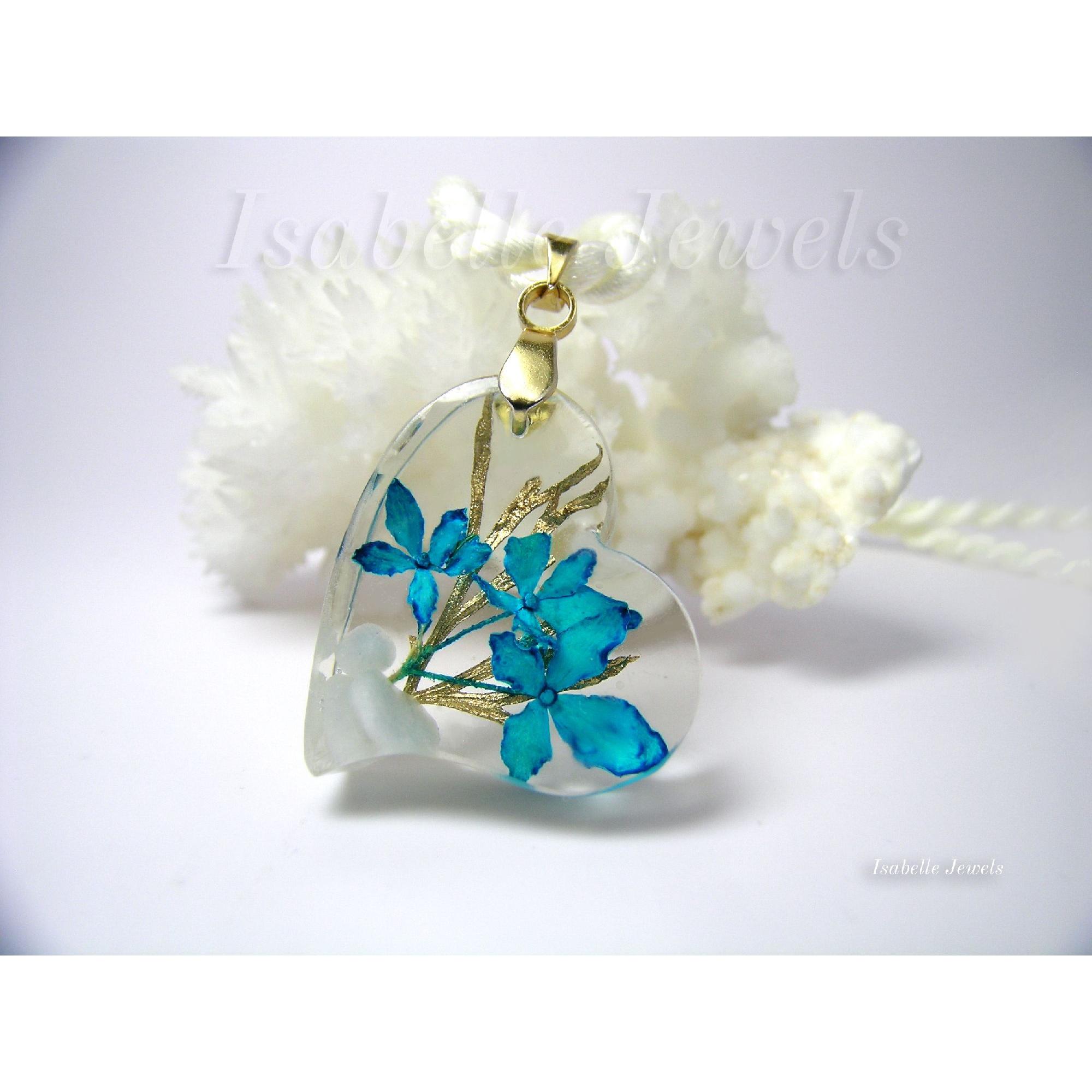 Collana con fiore di ortensia blu, cristallizzato nella resina trasparente.