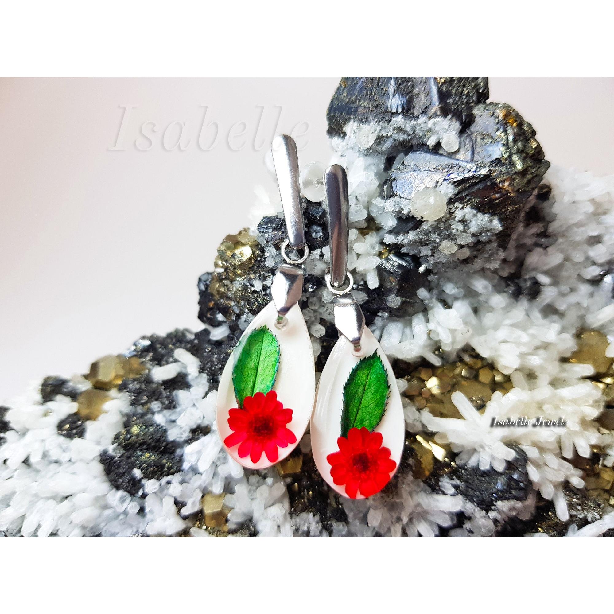 Particolari orecchini pendenti, realizzati con fiori rossi e foglie cristallizzate nella resina.