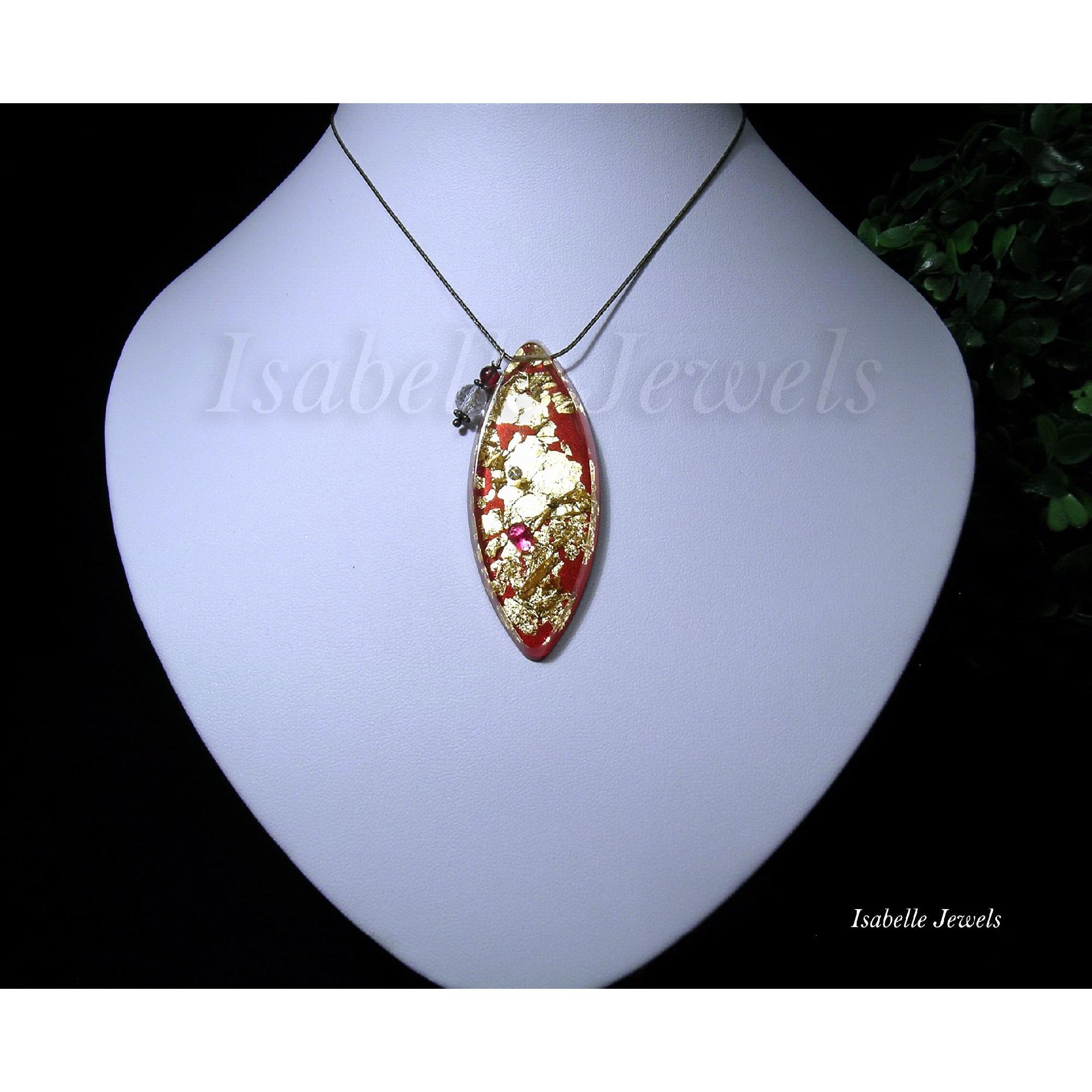 Collana rossa elegante realizzata in resina con pietre e foglia oro. Handmade resin gemstones, gold leaf pendant necklace.
