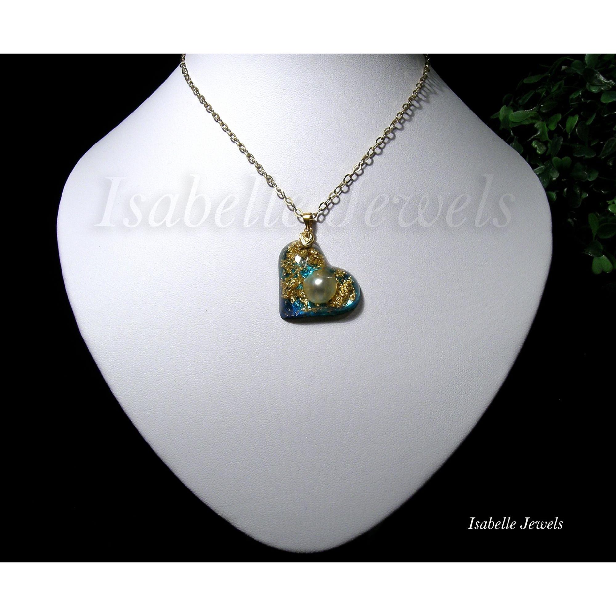 Collana con ciondolo a forma di cuore blu, con perla Mabe' e foglia oro. Minuteria in argento 925 dorato. Handmade resin, pearl, gold leaf pendant, necklace - Gioielli artigianali in resina epossidica. Handmade epoxy resin jewellery - MI TROVI ANCHE SU YouTube : Isabelle Jewels