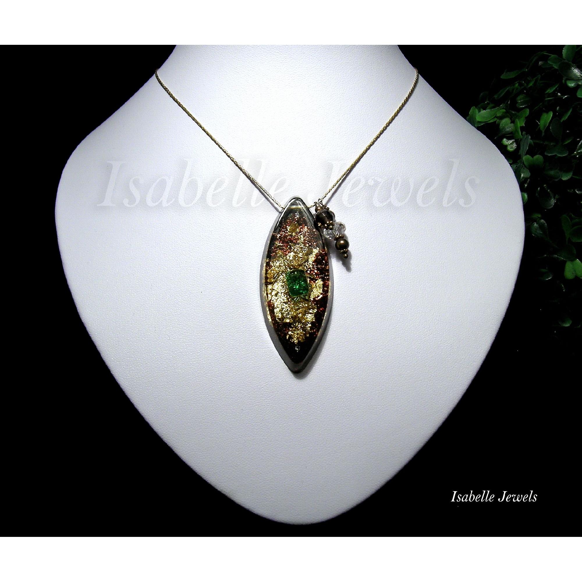 Gioielli in resina, collana artigianale con tormalina verde, foglia oro. Handmade resin, gemstones, gold leaf necklace. Resin artist