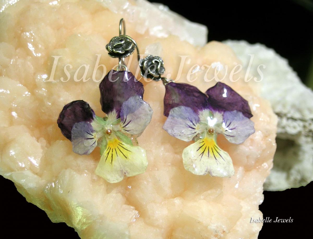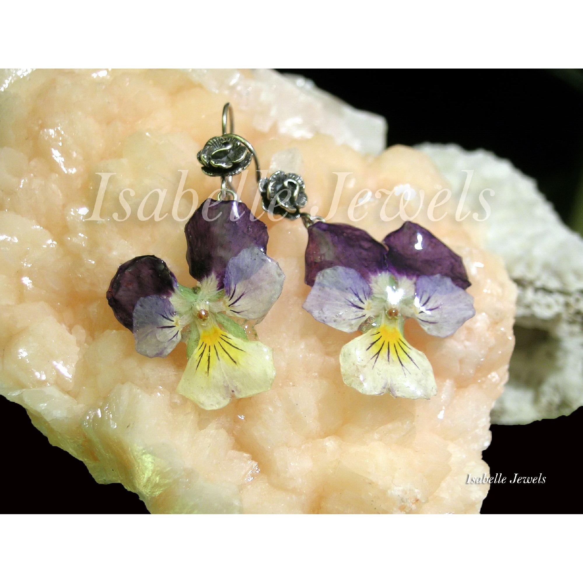 Orecchini con fiori veri, realizzati con due violette, selezionate e vetrificate con resina. Montatura in argento 925. Handmade real flowers panse', sterling silver earrings - Gioielli artigianali in resina epossidica con fiori veri, naturali, ed elementi botanici. Handmade real flowers, epoxy resin, botanical jewelry - MI TROVI ANCHE SU YouTube : Isabelle Jewels