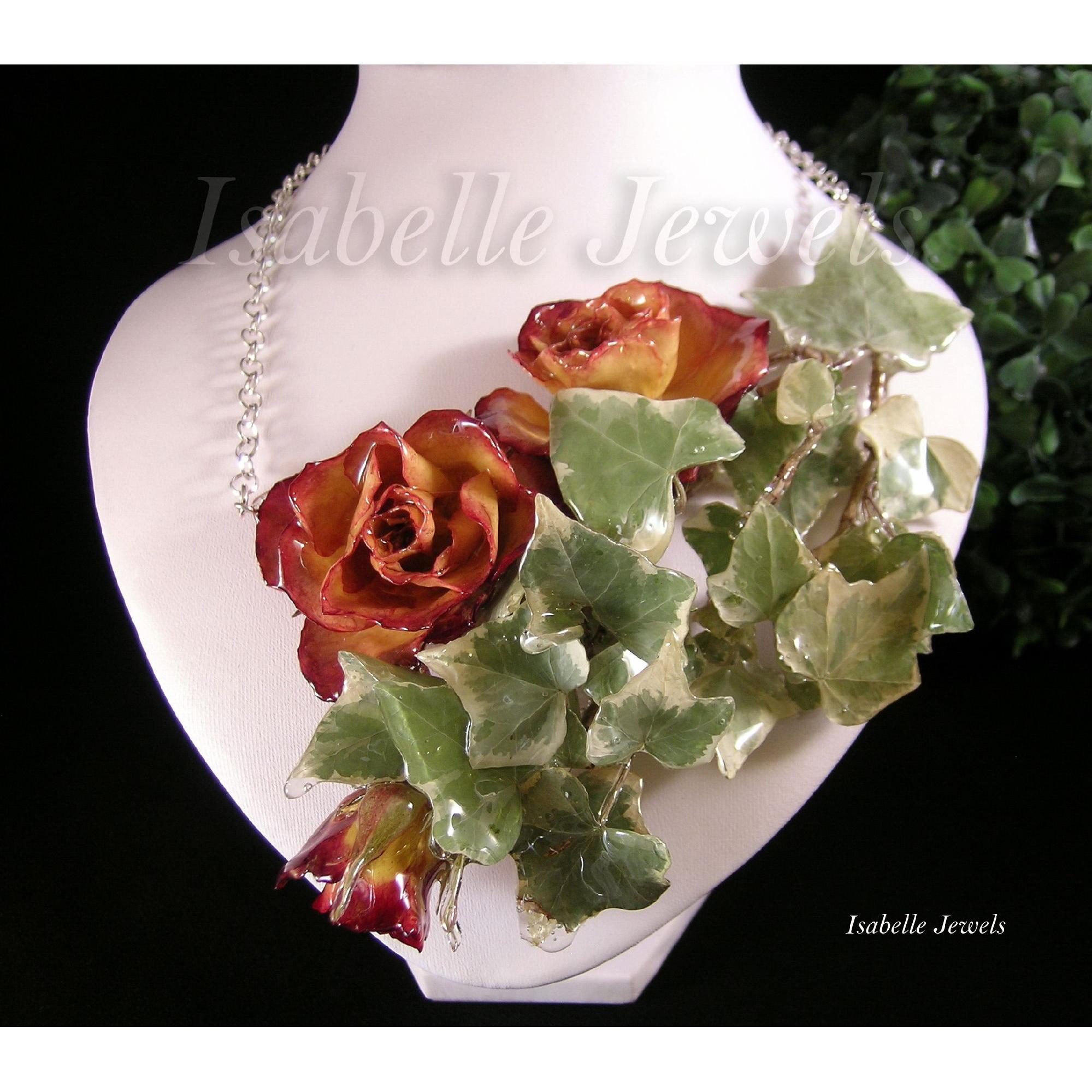Collana realizzata con fiori veri, rose naturali vetrificate con la resina, con edera variegata. Handmade epoxy resin, real roses necklace - Gioielli artigianali in resina epossidica, creazioni con fiori veri, naturali, ed elementi botanici. Handmade real flowers, epoxy resin jewelry - MI TROVI ANCHE SU YouTube: Isabelle Jewels