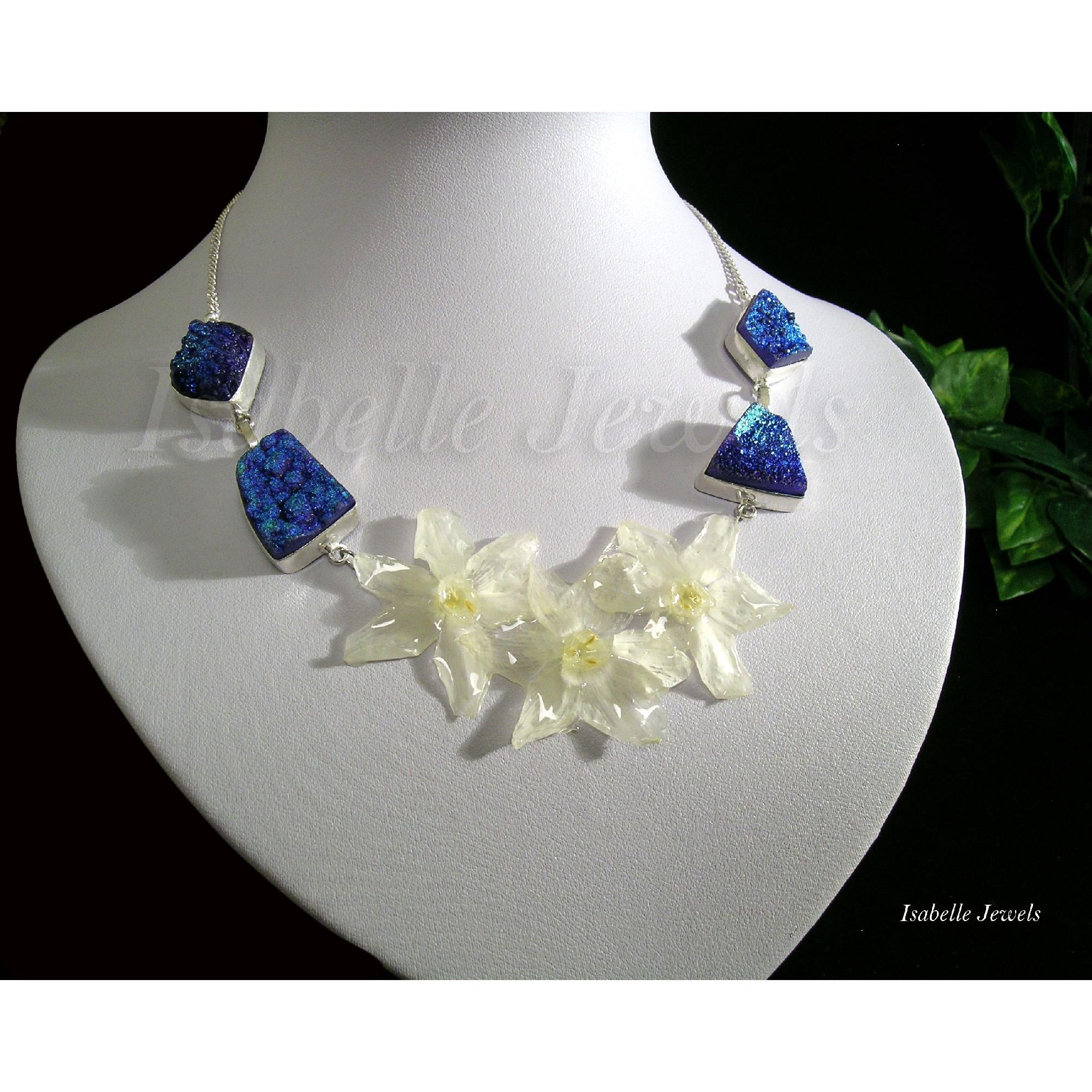 Collana realizzata con fiori bianchi ( narcisi ) selezionati e vetrificati, catena in argento 925 con pietre blu di agate druzy. Handmade sterling silver, flowers necklace - Gioielli artigianali in resina epossidica con fiori veri, naturali, ed elementi botanici. Handmade real flowers, epoxy resin jewelry - MI TROVI ANCHE SU YouTube : @isabellejewels