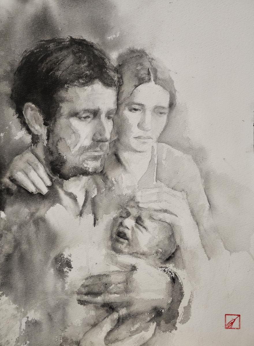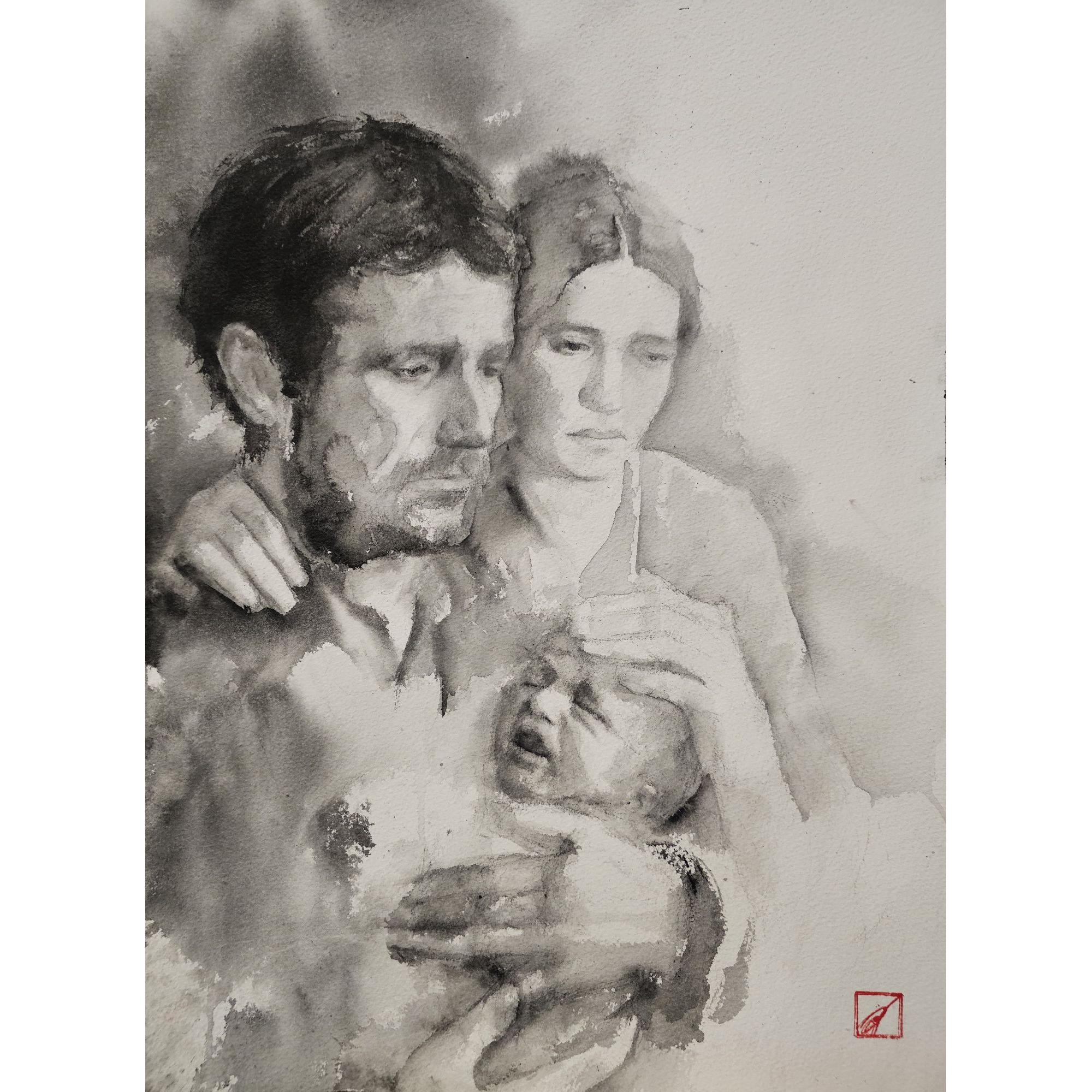 In quest’opera ho voluto dare un volto alla compassione universale che Giacomo Leopardi descrive nel suo Canto notturno. Ho raffigurato quel momento così umano e struggente in cui i genitori cercano di consolare il proprio figlio per il solo fatto di essere venuto al mondo. Attraverso l'inchiostro giapponese, ho cercato di rendere la fragilità e, al tempo stesso, la forza di questo legame: le pennellate si fanno velature, quasi a suggerire che il dolore e l'amore siano fatti della stessa sostanza liquida e inafferrabile. Per me, questo dipinto non parla di disperazione, ma dell'unica vera risposta possibile al destino: la tenerezza.