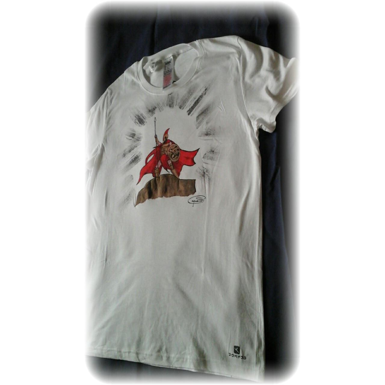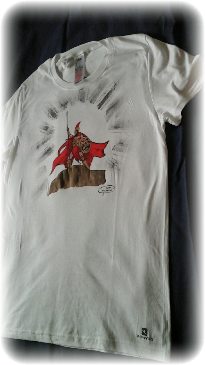 T-SHIRT BIANCA DIPINTA A MANO PER UOMO, TG. M (LARGHEZZA 51 CM ED ALTEZZA 75 CM), MANICHE CORTE. RAFFIGURANTE UN GLADIATORE ROMANO VINCITORE IN CIMA AD UNA ROCCIA. IL SIGNIFICATO DI QUESTO COMBATTENTE SI RIFERISCE ALLE PERSONE MOLTO COMBATTIVE