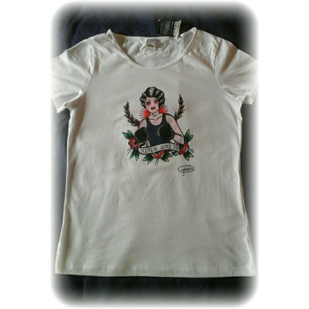 T-shirt da donna dipinta a mano, maniche corte. Realizzata con colori permanenti per stoffa. Misure: Larghezza 48 cm - lunghezza : 67 cm. Il disegno è in stile tattoo hold school ed è ispirato alle donne che non si arrendono mai, sempre pronte a lottare.