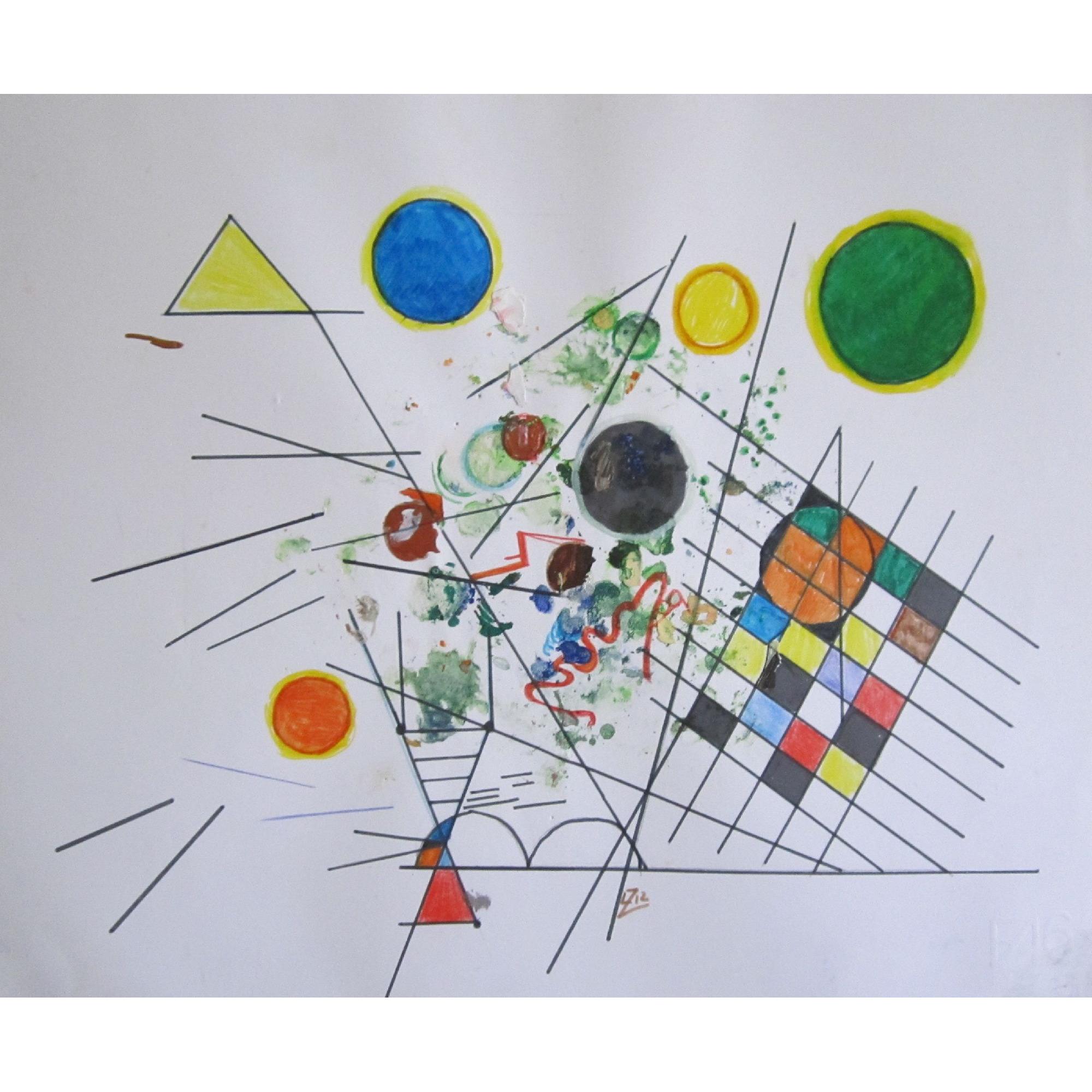 L'opera è nata osservando un cartoncino bristol utilizzato per prove colori: vi sono quindi inseriti piccoli pezzetti di acrilico secchi oltre a pennarelli. Protetta con termosaldatura, senza vetro, pp.t nero e cornice nera. Il tutto è cm 45 x 45
