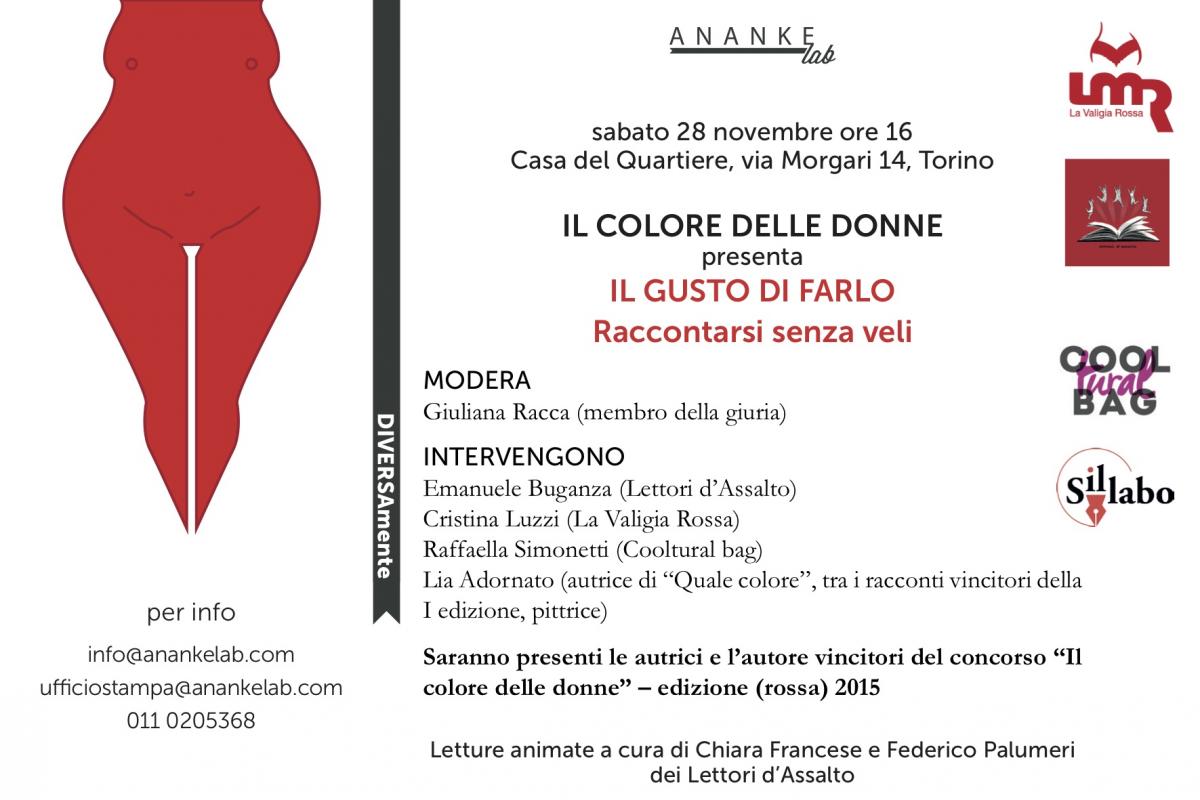 Mostra personale il giorno 28 novembre 2015, alla presentazione del libro "Il gusto di farlo. Raccontarsi senza veli", nonché premiazione del concorso letterario "Il colore delle donne", di Anankelab.