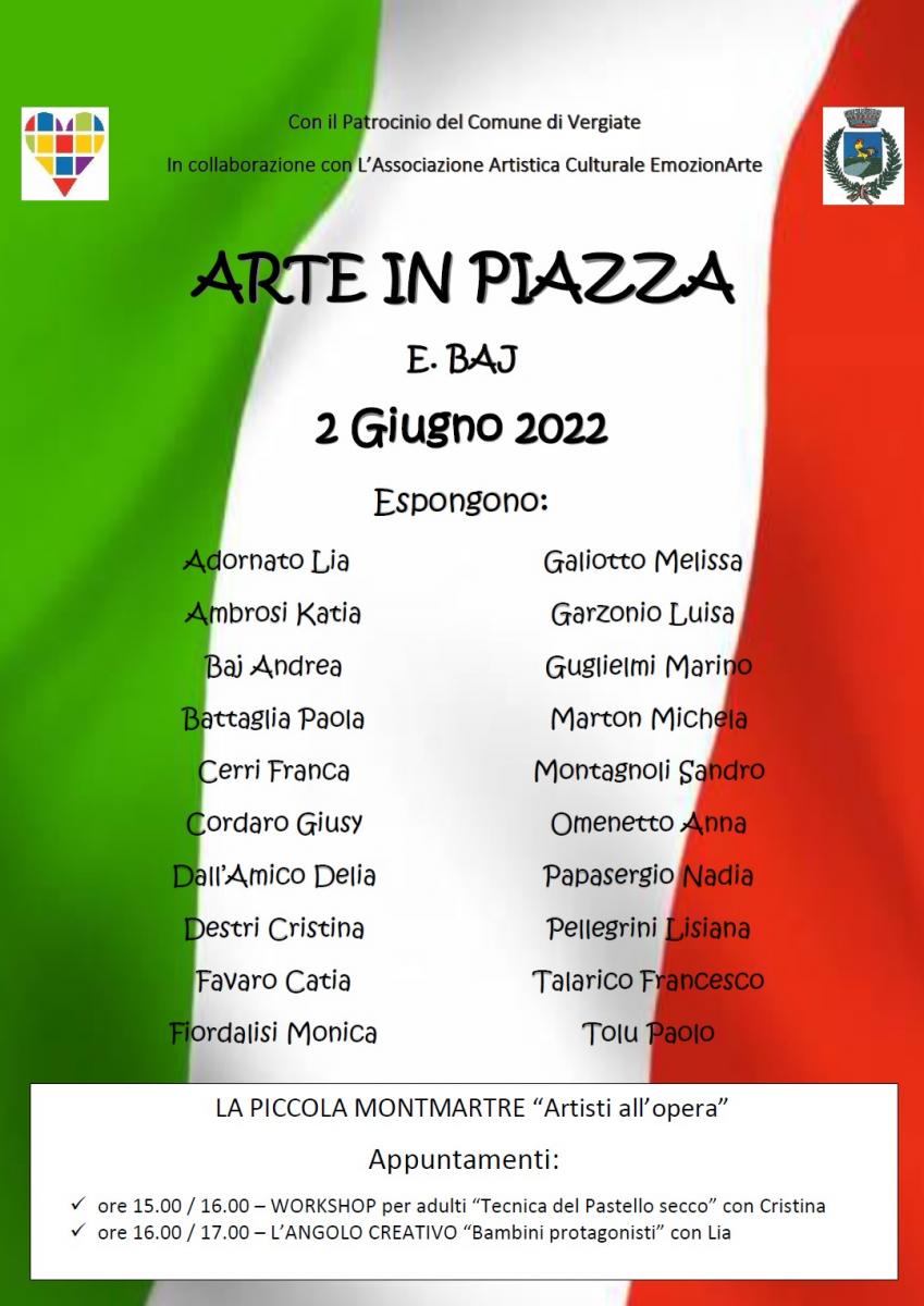 L'associazione artistica Emozionarte di Cristina Destri organizza, con il patrocino del Comune di Vergiate, una mostra collettiva di artisti vergiatesi. Le opere saranno esposte in piazza Baj, a Vergiate, il 2 giugno 2022, dalle 9 alle 19. Tante le iniziative per la giornata, che si svolgeranno insieme alla mostra: dal battesimo civico, alle bancarelle degli hobbisti, alla musica.