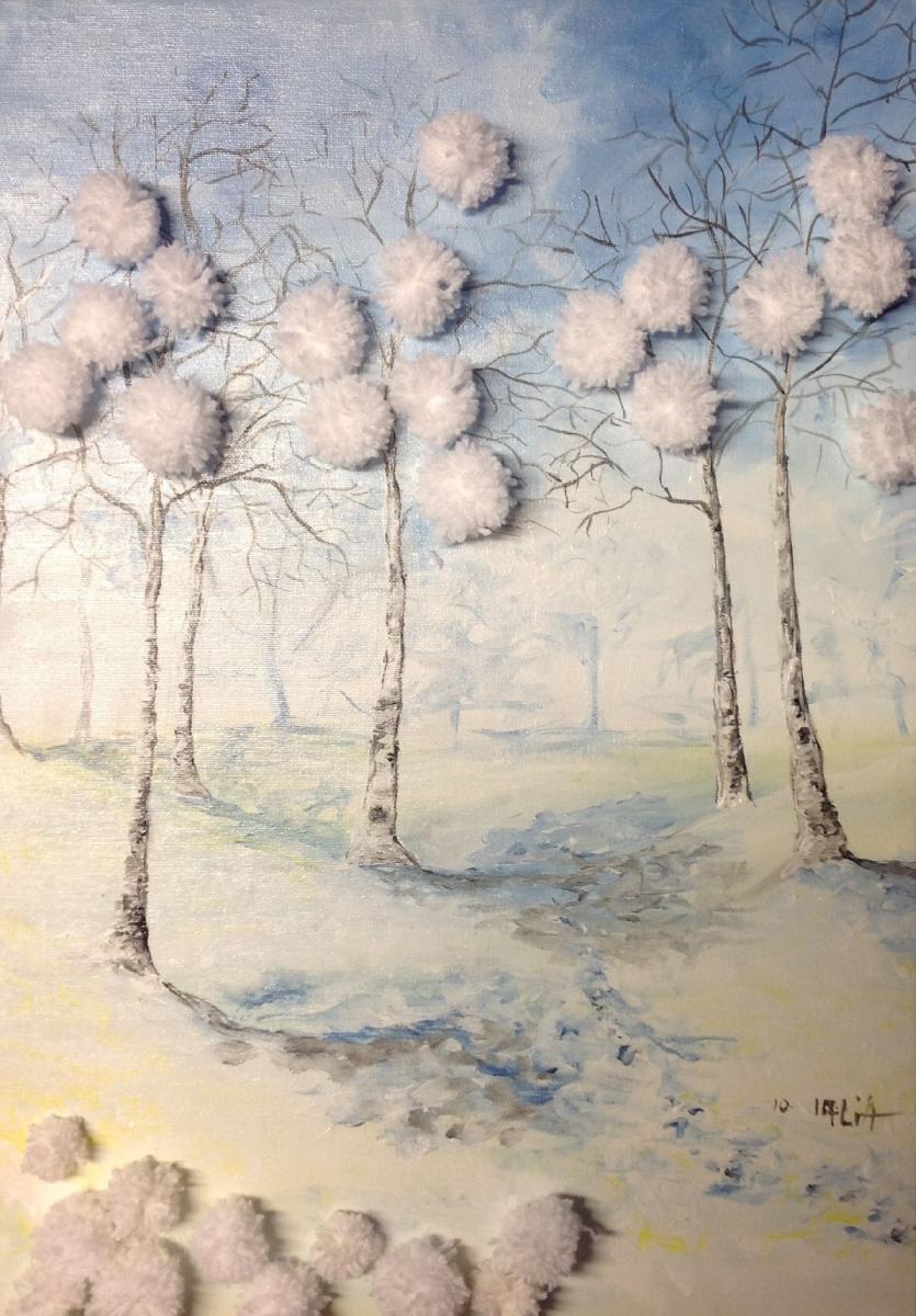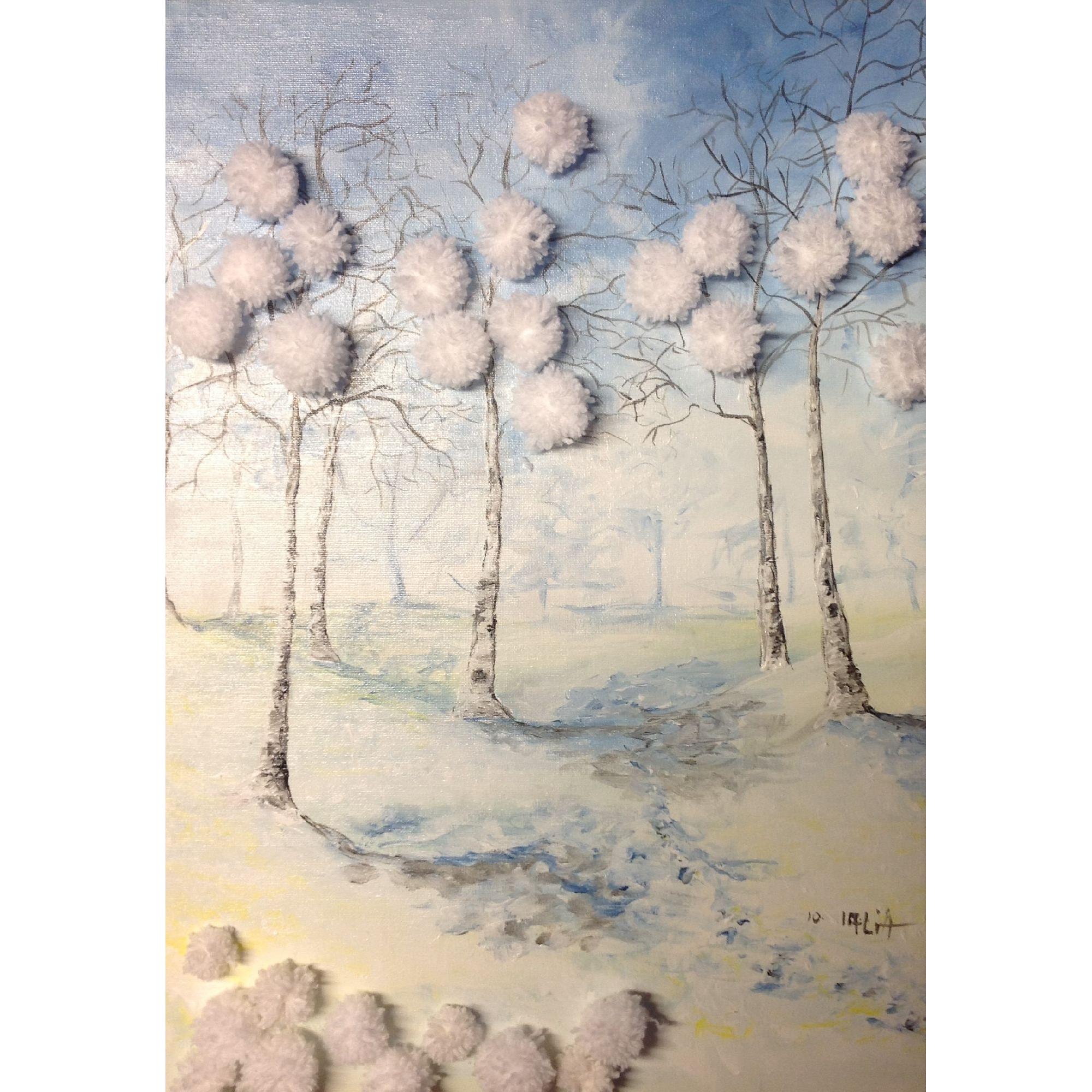 Creato appositamente per l'evento Magliuomini Clover 2017 #2017, esposto alla fiera Abilmente Vicenza nel 2017. La tecnica è mista, su un paesaggio creato con gli acrilici si adagiano soffici pompon bianchi, come fiocchi di neve, creando un piacevole effetto di profondità.