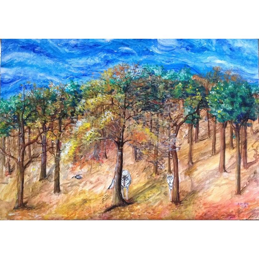 Un bosco e i suoi abitanti: una coppia di lupi osservano da dietro gli alberi. Ci sono castagni e pini silvestri, lupi e ghiandaie. Il cielo si muove.