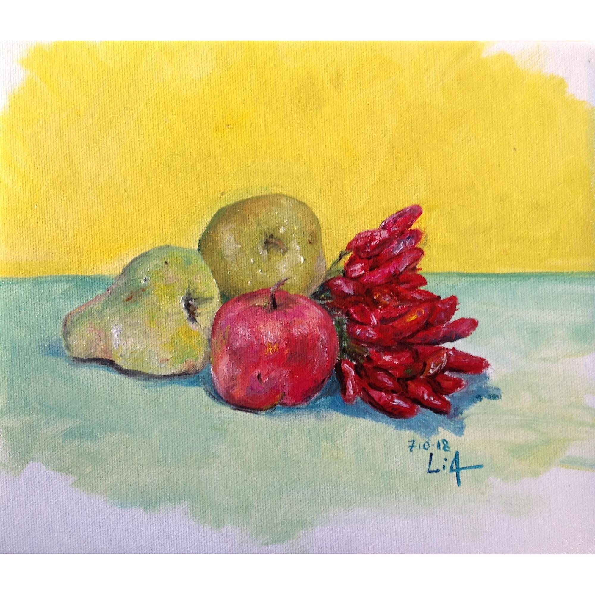 Mele e peperoncini dipinti in estemporanea, olio su tela, alla fiera di Legambiente di Cuirone (luogo del FAI) il giorno 7 ottobre 2018.