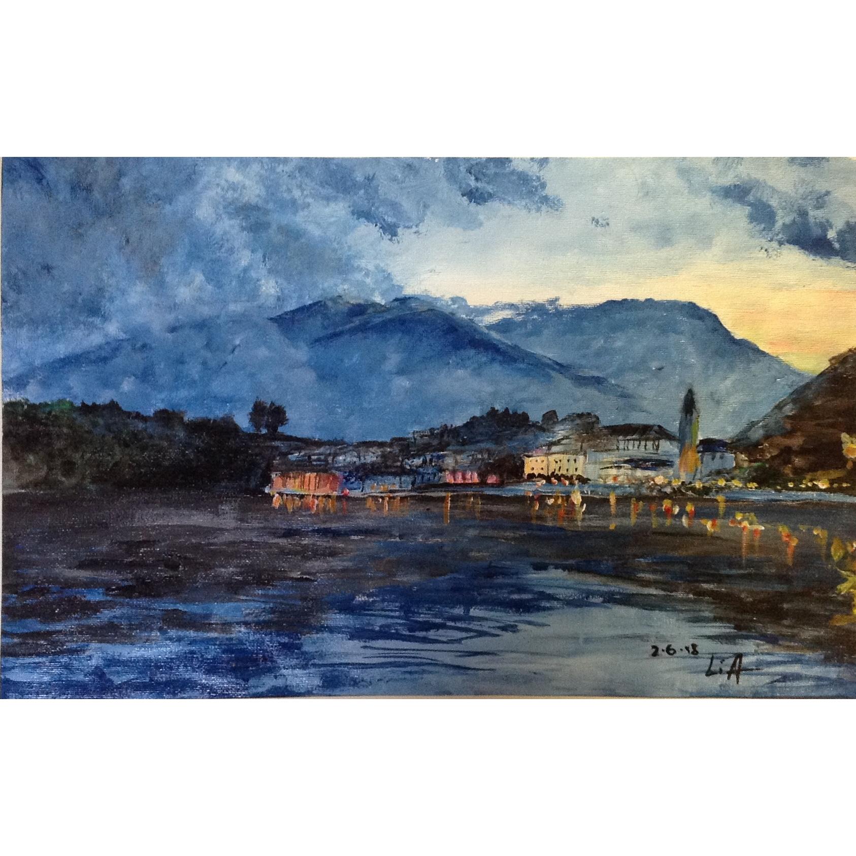 Lago di Mergozzo, da una foto di Obretta Tornimbeni, sera dopo un temporale. Acrilici su tela, attualmente in cornice 40x50cm.
