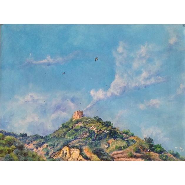 La casa della tramontana sta su una collina di fronte al mare, tra venti e voli di balestrucci, sotto al sole. Paesaggio siciliano, tela senza telaio.
