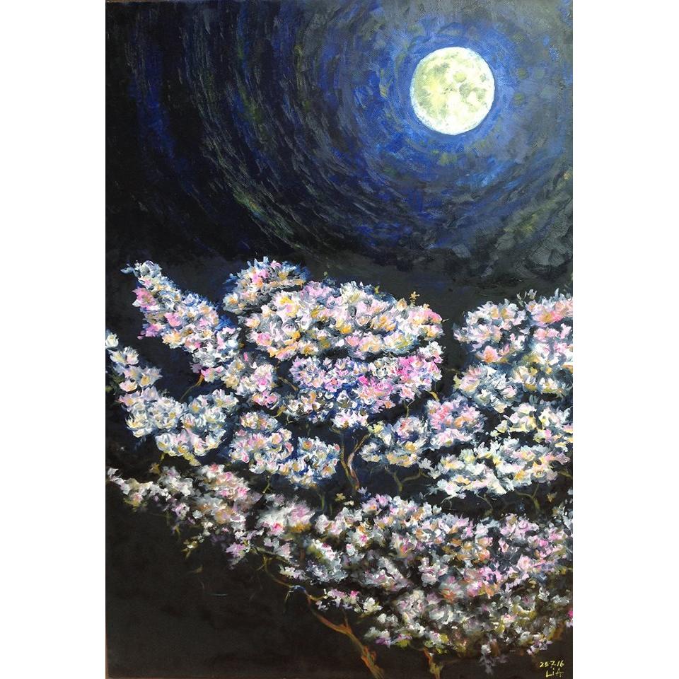 La luna piena e l'albero fiorito di magnolia, una notte di marzo, mentre la natura si risveglia silenziosa.