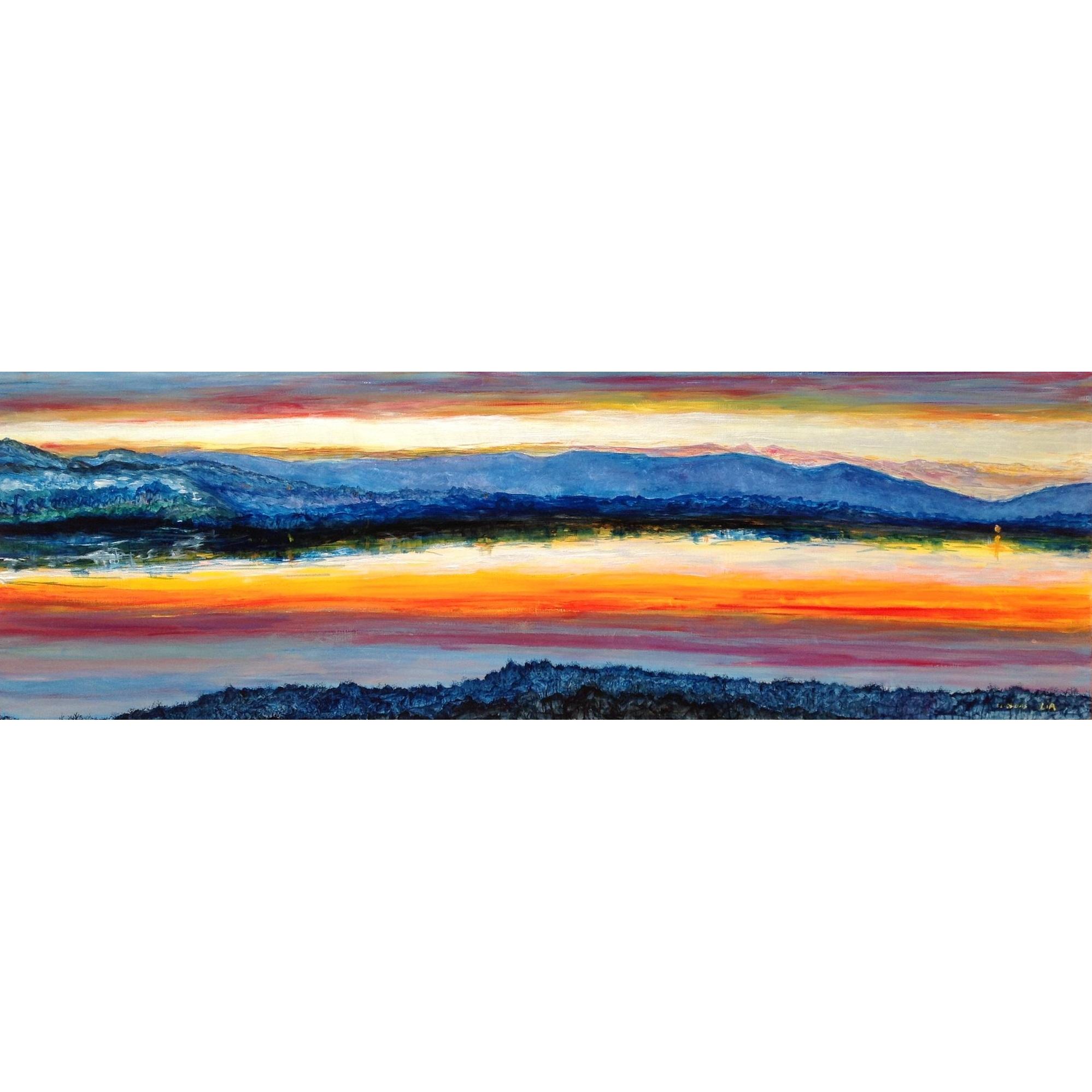 Lago di Varese, visto da Varese, al tramonto. Acrilici su compensato, fissato alla parte con clip e tasselli.