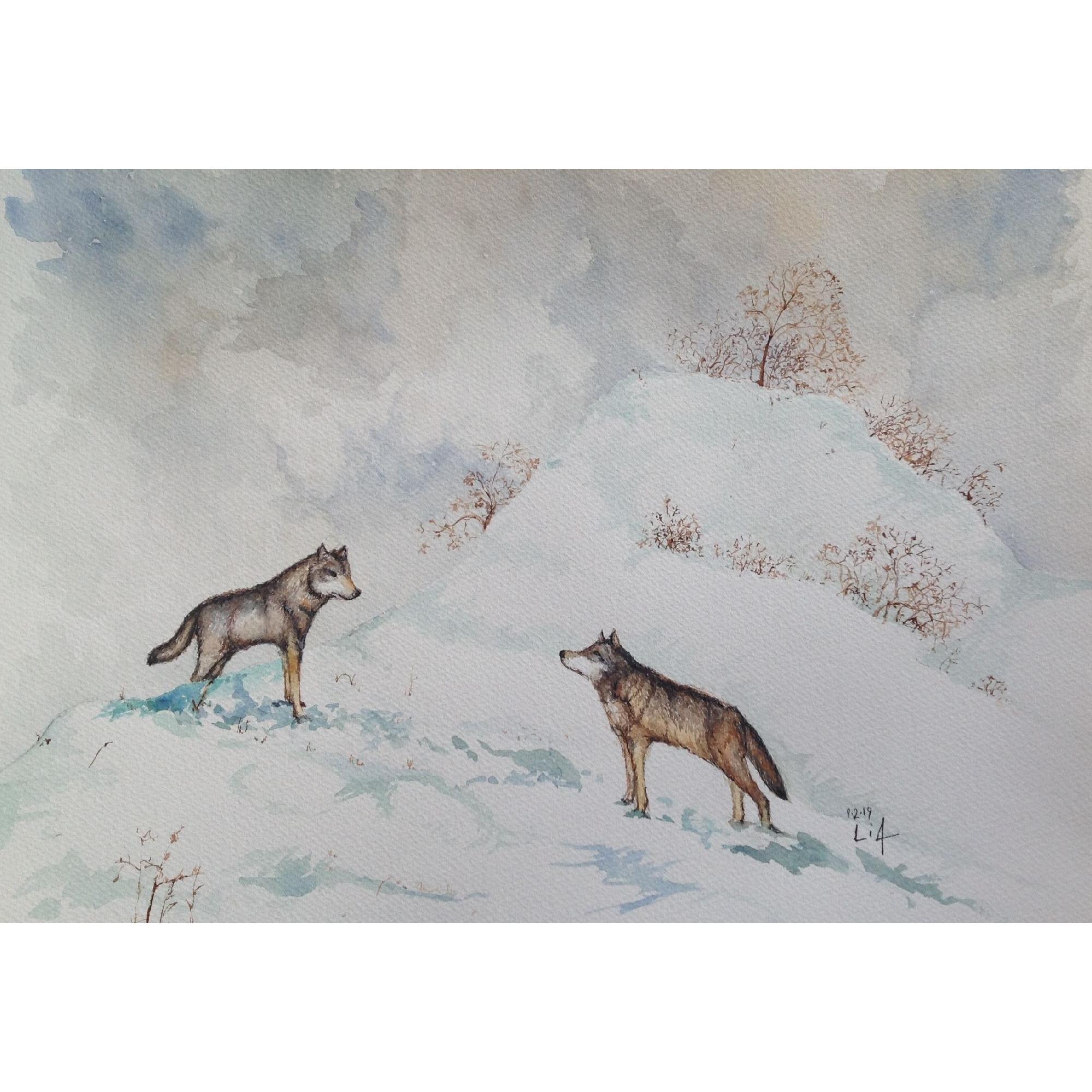 I lupi, grandi viaggiatori, simbolo della natura selvaggia. Una coppia di lupi a un valico innevato. Acquerelli su cartoncino. Attualmente incorniciato.