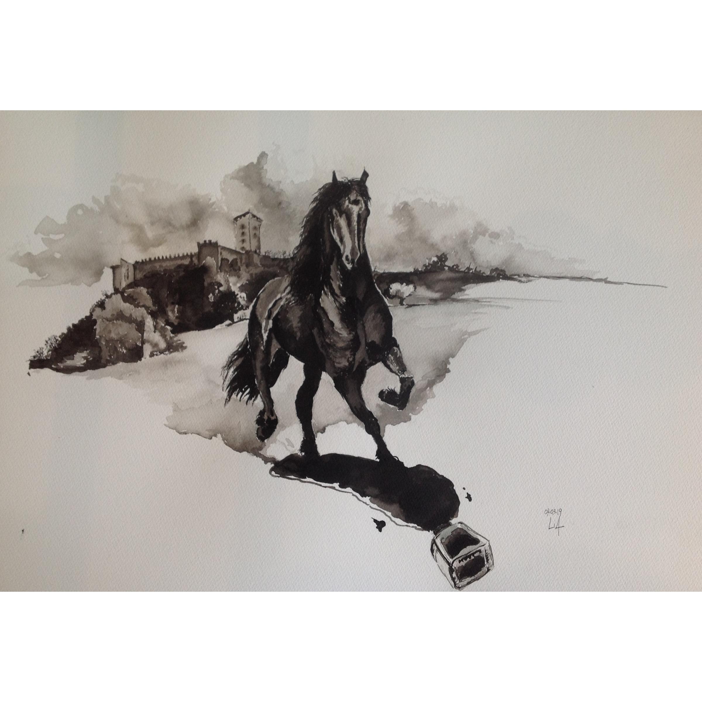 Cavallo frisone con Rocca di Angera di sfondo, situazione surreale.