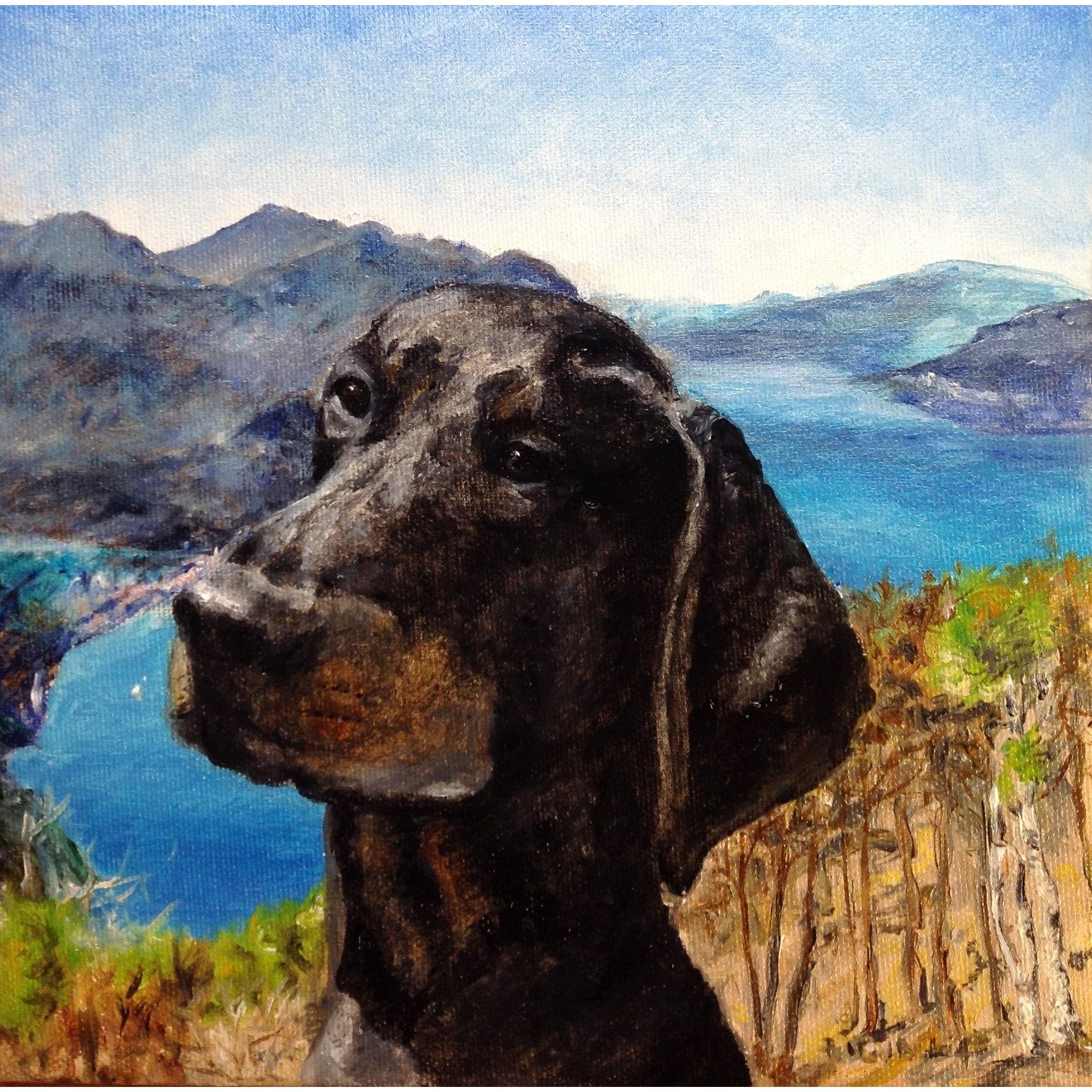Un cane dobermann, il belvedere Mandelli di Agra, Lago Maggiore, in una bella giornata. Eseguito su commissione, ritratto di cane.