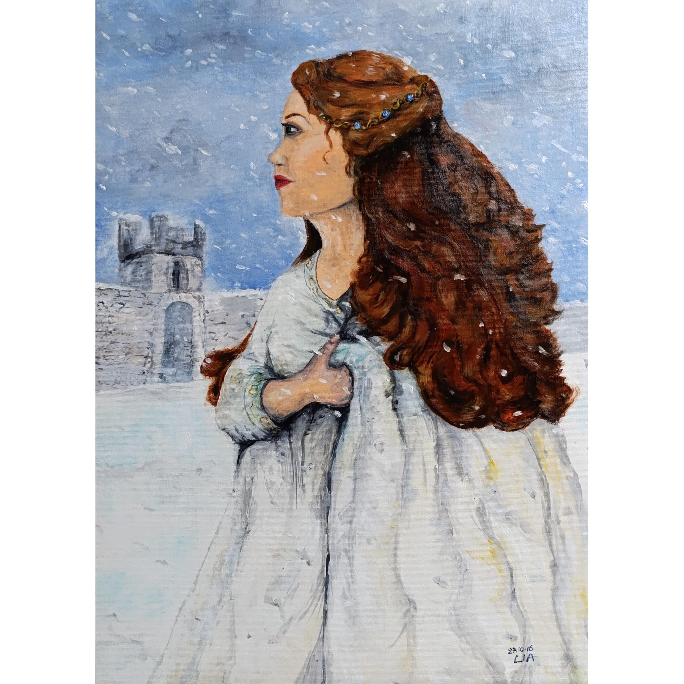 Il luogo del dipinto esiste realmente, è la Rocca di Orino, in provincia di Varese. MI piaceva l'idea di lunghi capelli ramati sotto a una nevicata. Soggetto un po' fantasy. Olio su tela.
