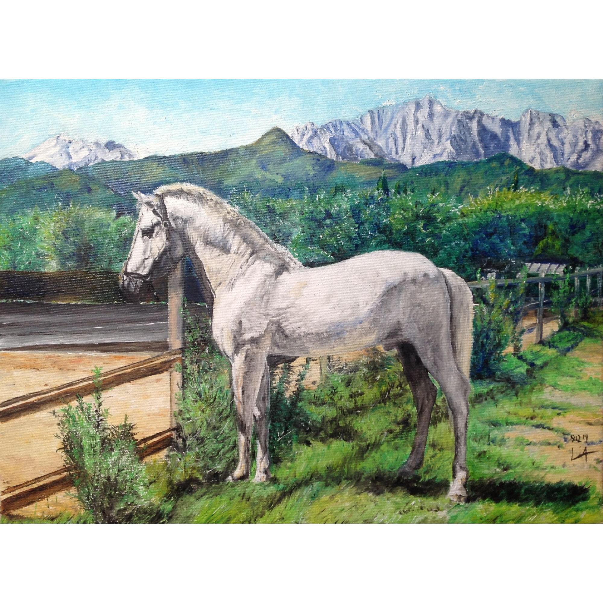Una commissione, uno splendido cavallo immerso nella natura, le Alpi Apuane di sfondo.