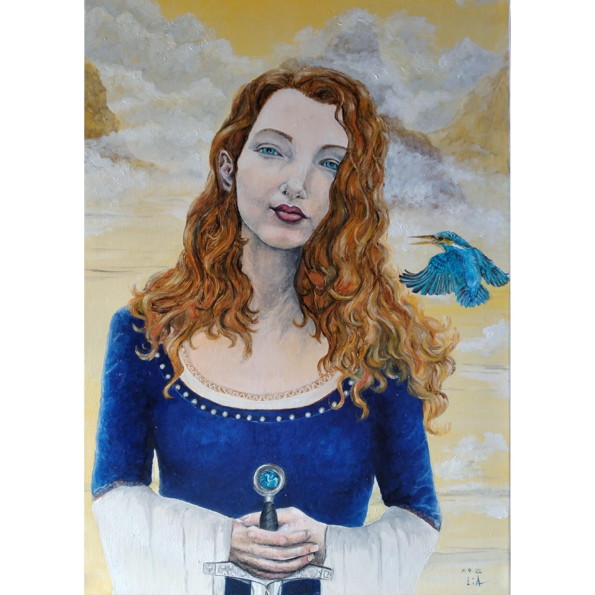 Rappresentazione della leggendaria Dama del Lago, Viviana, sullo sfondo Avalon, l'isola delle nebbie.