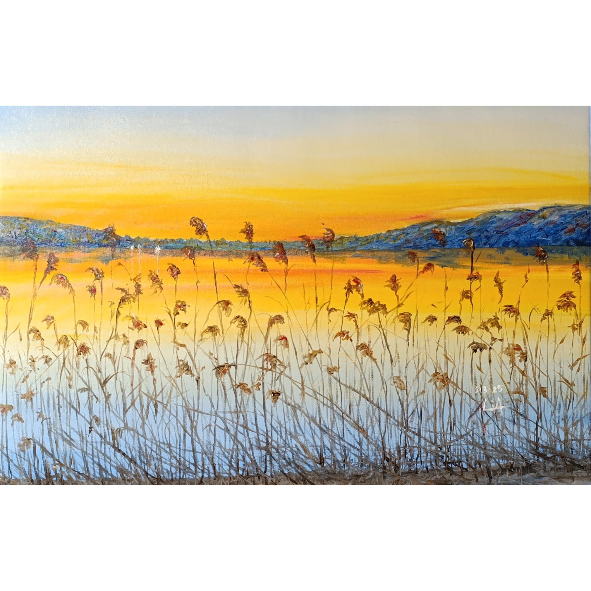 Lago di Comabbio, il tramonto, l'ora blu. Olio su tela con vernice protettiva damar.