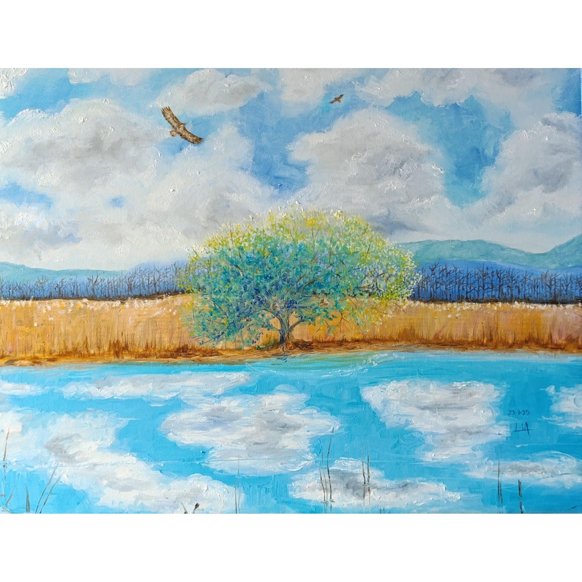 Una vista di lago al contrario, lo sguardo è rivolto verso la riva, su un salicone, con un volo di poiane in un cielo capriccioso di marzo.