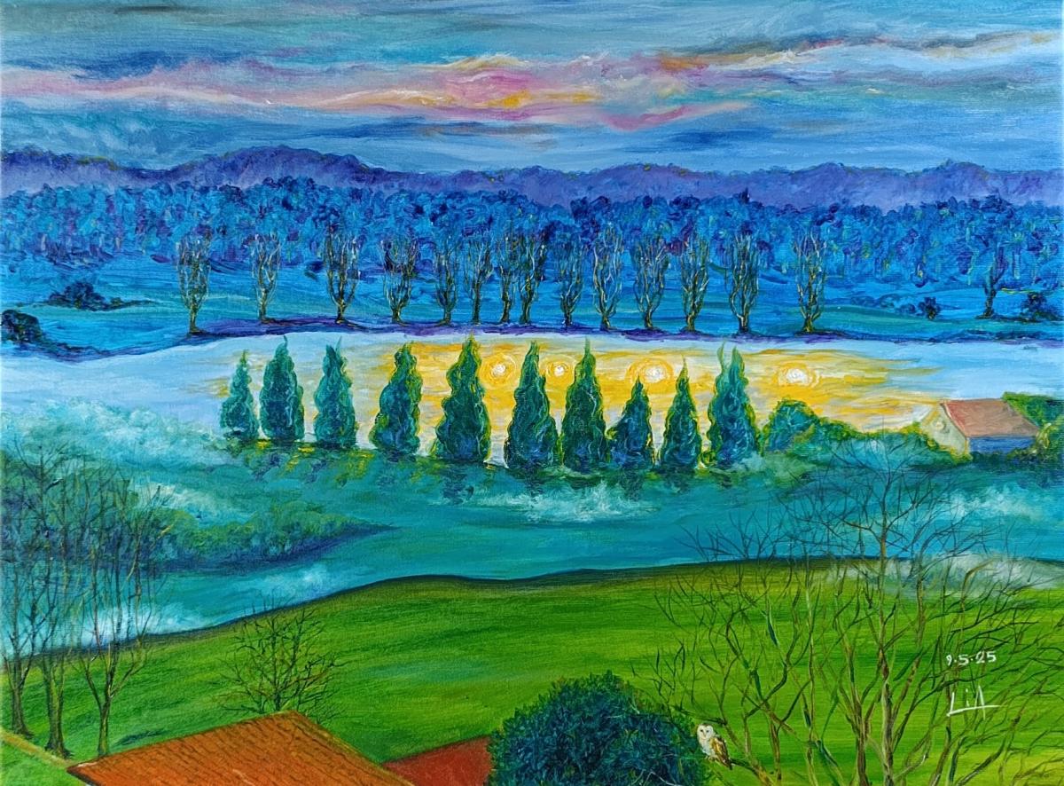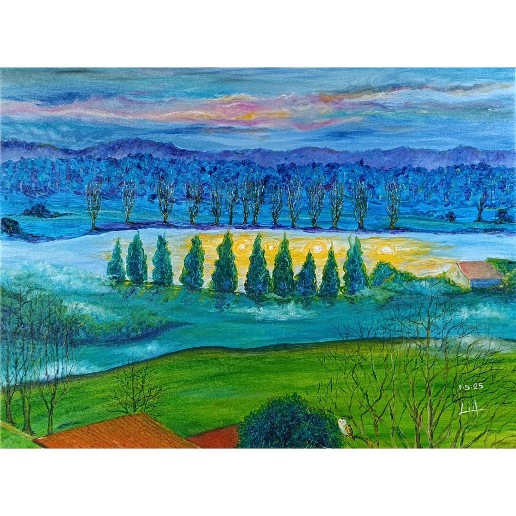Un paesaggio notturno e onirico, una vista su un fiume sfiorato da una fila di luci misteriose, un barbagianni fa capolino dai rami di un grande albero.