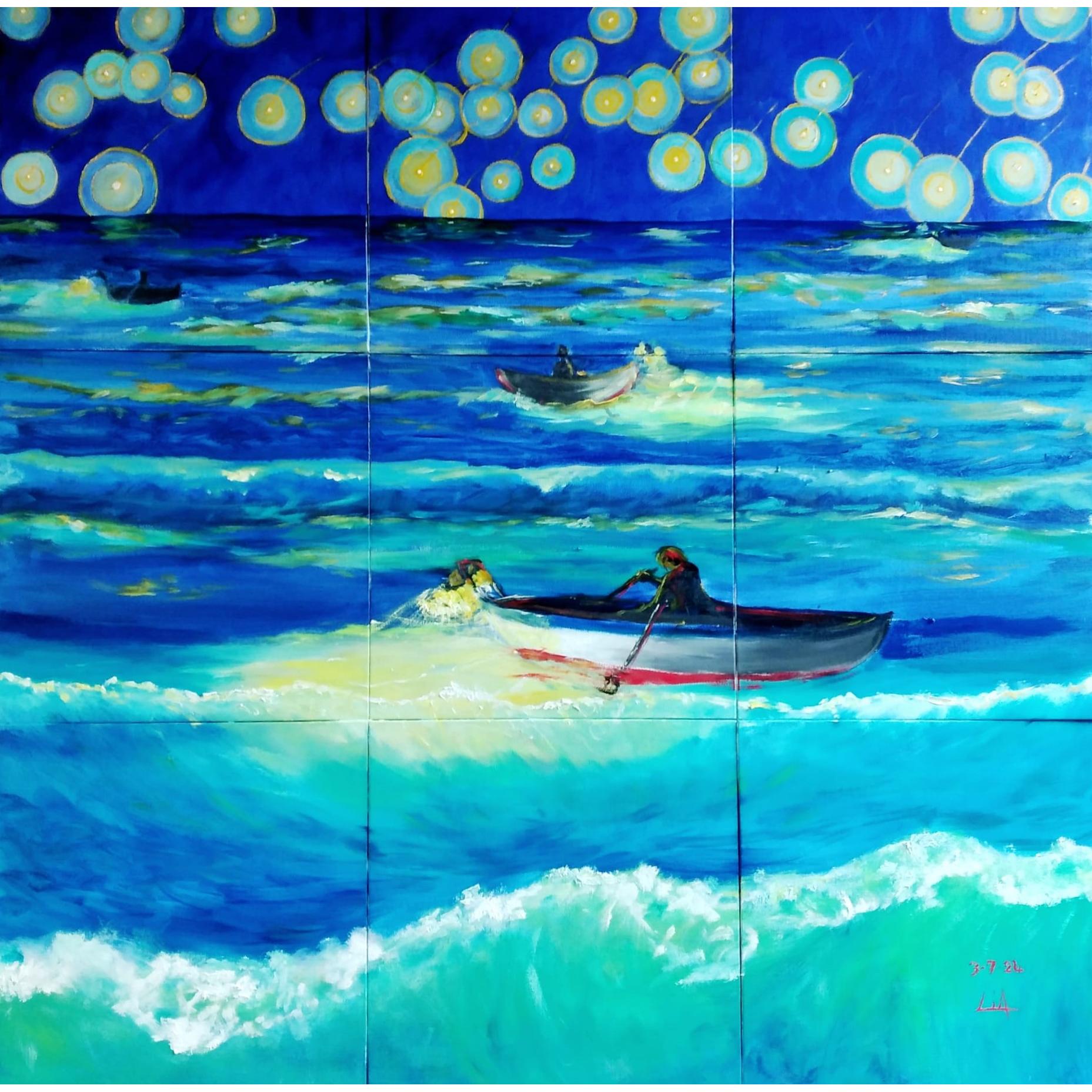 Notte di San Lorenzo sul mare, le meteoriti cadono sull'acqua, già illuminata a tratti dalle lampare uscite dal porto per la pesca notturna.