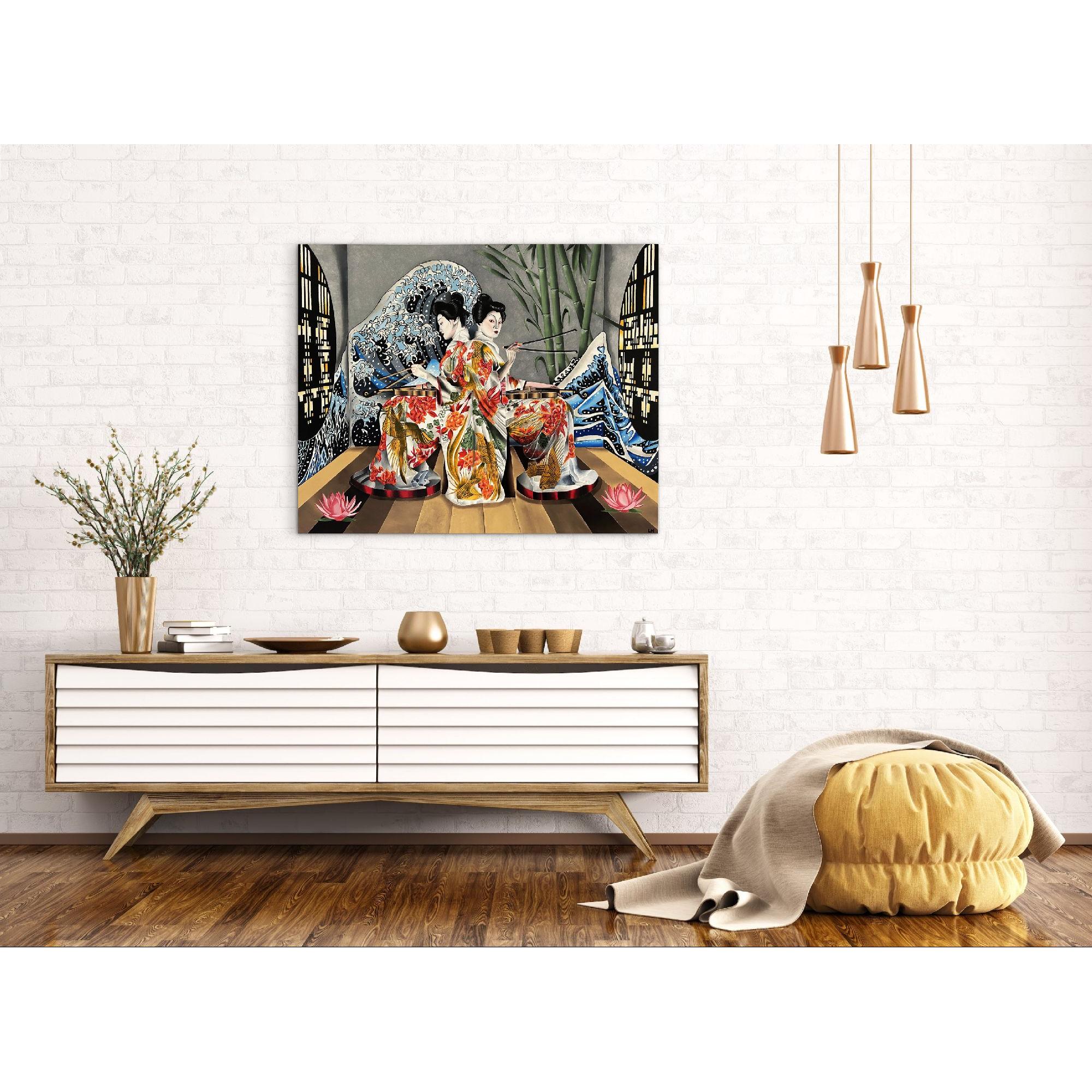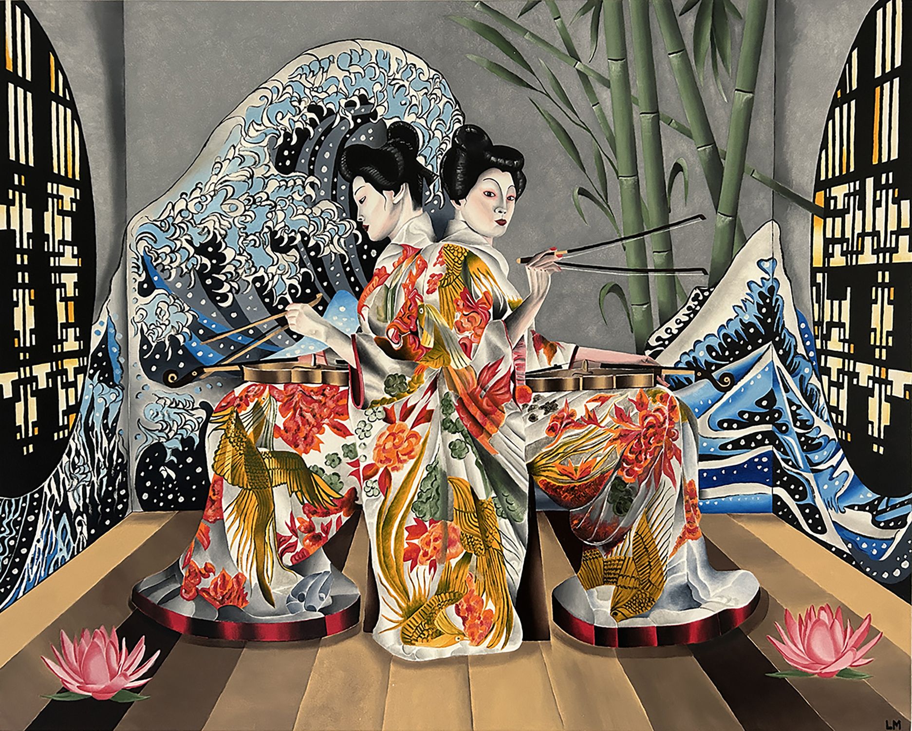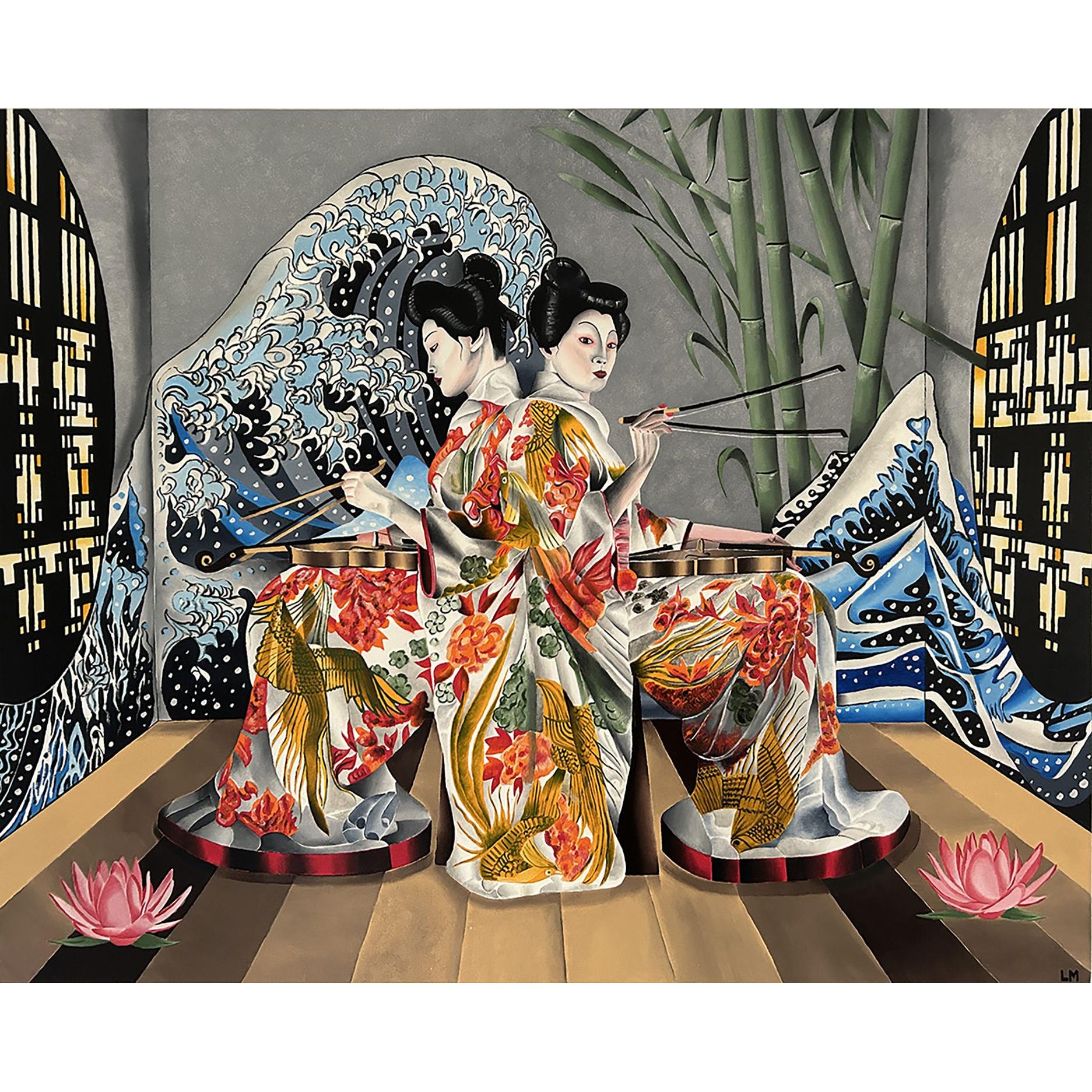 L'immagine presenta due donne vestite con kimono elaborati, che suonano strumenti musicali, immerse in un ambiente ispirato all'arte giapponese.La composizione mostra due donne identiche, speculari l'una all'altra, sedute e rivolte verso il centro, impegnate a suonare un violino.L'azione si concentra su questo elemento centrale, con le donne che usano bacchette per suonare. Lo sfondo è simmetrico e ricco di elementi decorativi: onde stilizzate di colore blu e bianco, come quelle dell'arte di Hokusai, fanno da cornice alle figure, mentre sullo sfondo si intravedono dei bambù e delle finestre con un design geometrico.La disposizione degli elementi crea un senso di equilibrio e armonia, tipico dell'arte giapponese