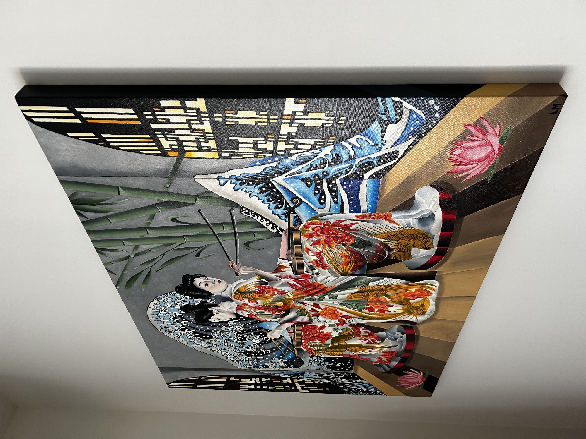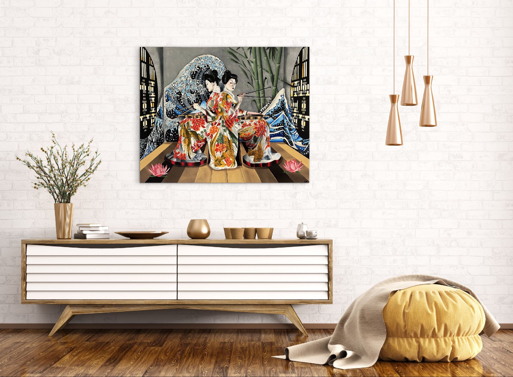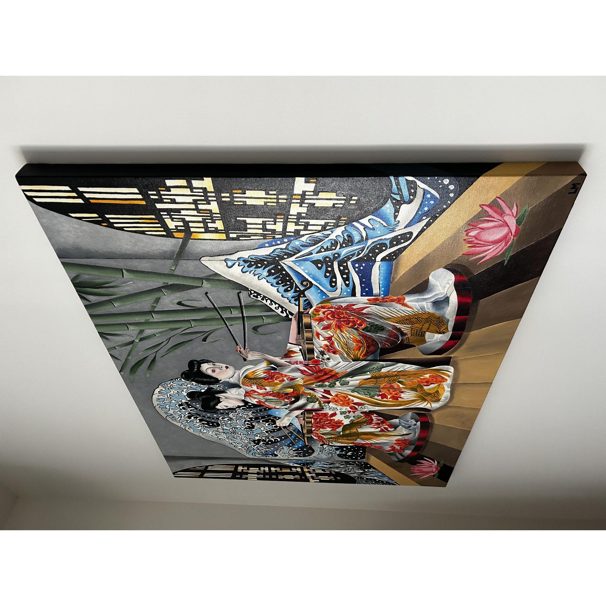 L'immagine presenta due donne vestite con kimono elaborati, che suonano strumenti musicali, immerse in un ambiente ispirato all'arte giapponese.La composizione mostra due donne identiche, speculari l'una all'altra, sedute e rivolte verso il centro, impegnate a suonare un violino.L'azione si concentra su questo elemento centrale, con le donne che usano bacchette per suonare. Lo sfondo è simmetrico e ricco di elementi decorativi: onde stilizzate di colore blu e bianco, come quelle dell'arte di Hokusai, fanno da cornice alle figure, mentre sullo sfondo si intravedono dei bambù e delle finestre con un design geometrico.La disposizione degli elementi crea un senso di equilibrio e armonia, tipico dell'arte giapponese