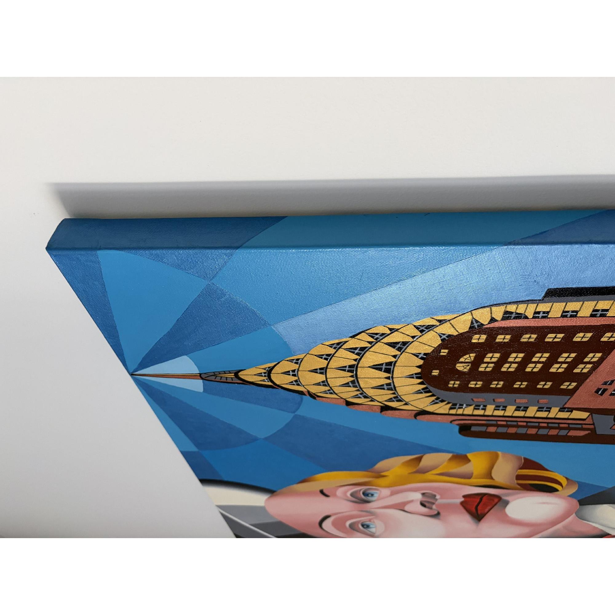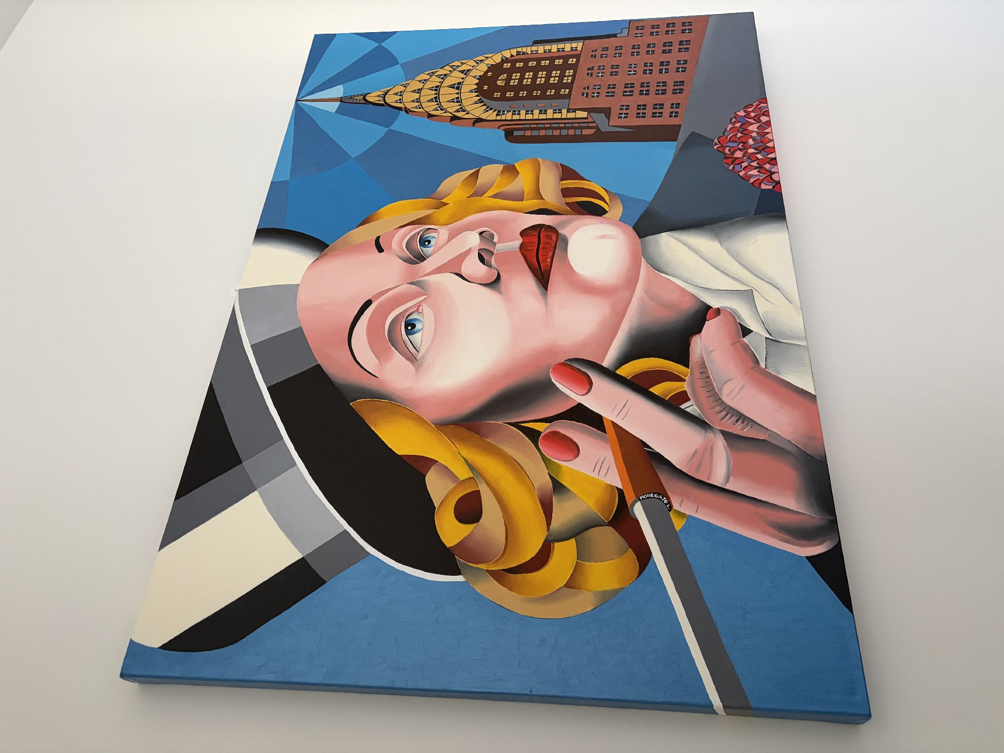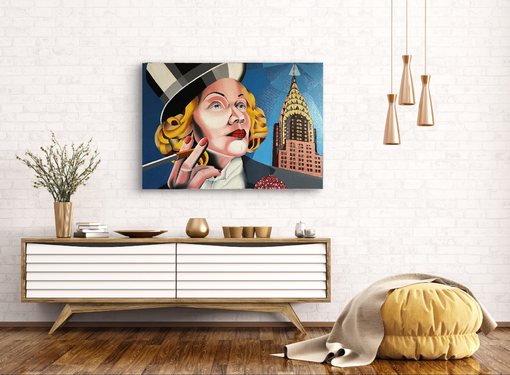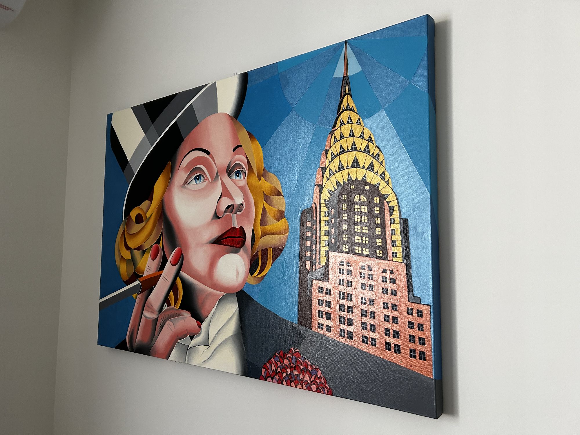 Un'illustrazione stilizzata raffigura Marlene Dietrich, icona del cinema, con una sigaretta in bocca, affiancata dall'iconico Chrysler Building di New York.La composizione è strutturata in modo dinamico: Marlene Dietrich è posta in primo piano, leggermente a sinistra, con lo sguardo rivolto verso l'alto; sulla destra, sullo sfondo, si erge il Chrysler Building, creando un contrasto tra la figura umana e l'architettura.Lo sfondo è costituito da un cielo blu intenso, con elementi geometrici che evocano un'atmosfera moderna e sofisticata.La luce sembra provenire dall'alto, illuminando il volto di Marlene Dietrich e creando ombre che definiscono le forme.L'atmosfera è elegante e iconica, tipica dell'epoca d'oro di Hollywood e della città di New York. Il contrasto tra la figura umana e il paesaggio urbano crea un effetto suggestivo, sottolineando l'importanza dell'icona cinematografica e del suo contesto.