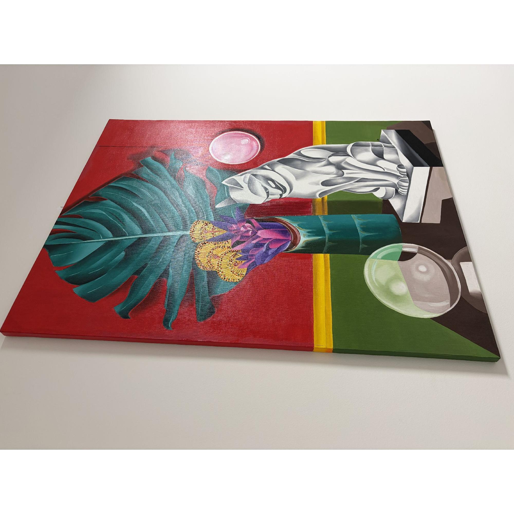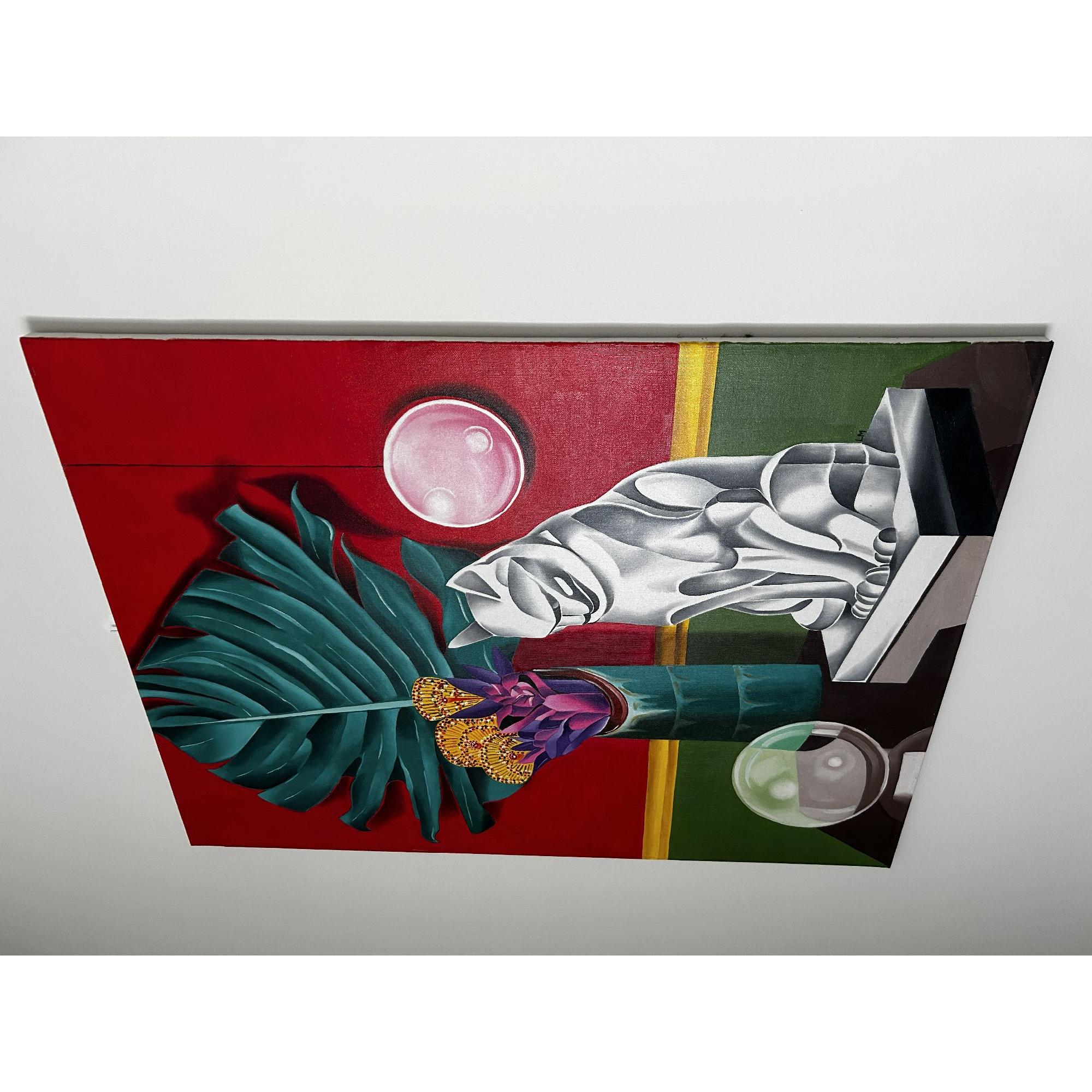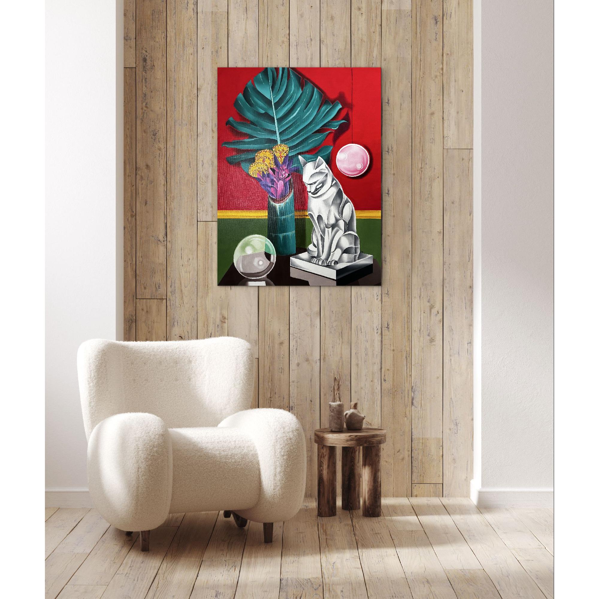 Questo dipinto vibrante e surreale presenta una natura morta accuratamente realizzata con una tavolozza di colori audaci.A dominare la composizione è una grande foglia stilizzata di monstera verde, su uno sfondo rosso acceso con un bordo giallo-verde.Un alto vaso nei toni del verde acqua contiene un mix di succulente viola acceso e intricati fiori gialli circolari.Sulla destra, un'elegante scultura geometrica di un gatto, realizzata nei toni del grigio e del bianco, è posta su un piedistallo, emanando un'atmosfera moderna, quasi art déco.Sopra il gatto fluttua una sfera rosa brillante, mentre una sfera di vetro, che riflette i colori circostanti, poggia su un tavolo scuro sottostante.L'effetto complessivo è al tempo stesso elegante ed enigmatico, fondendo elementi di natura, arte e astrazione in una sorprendente armonia visiva.