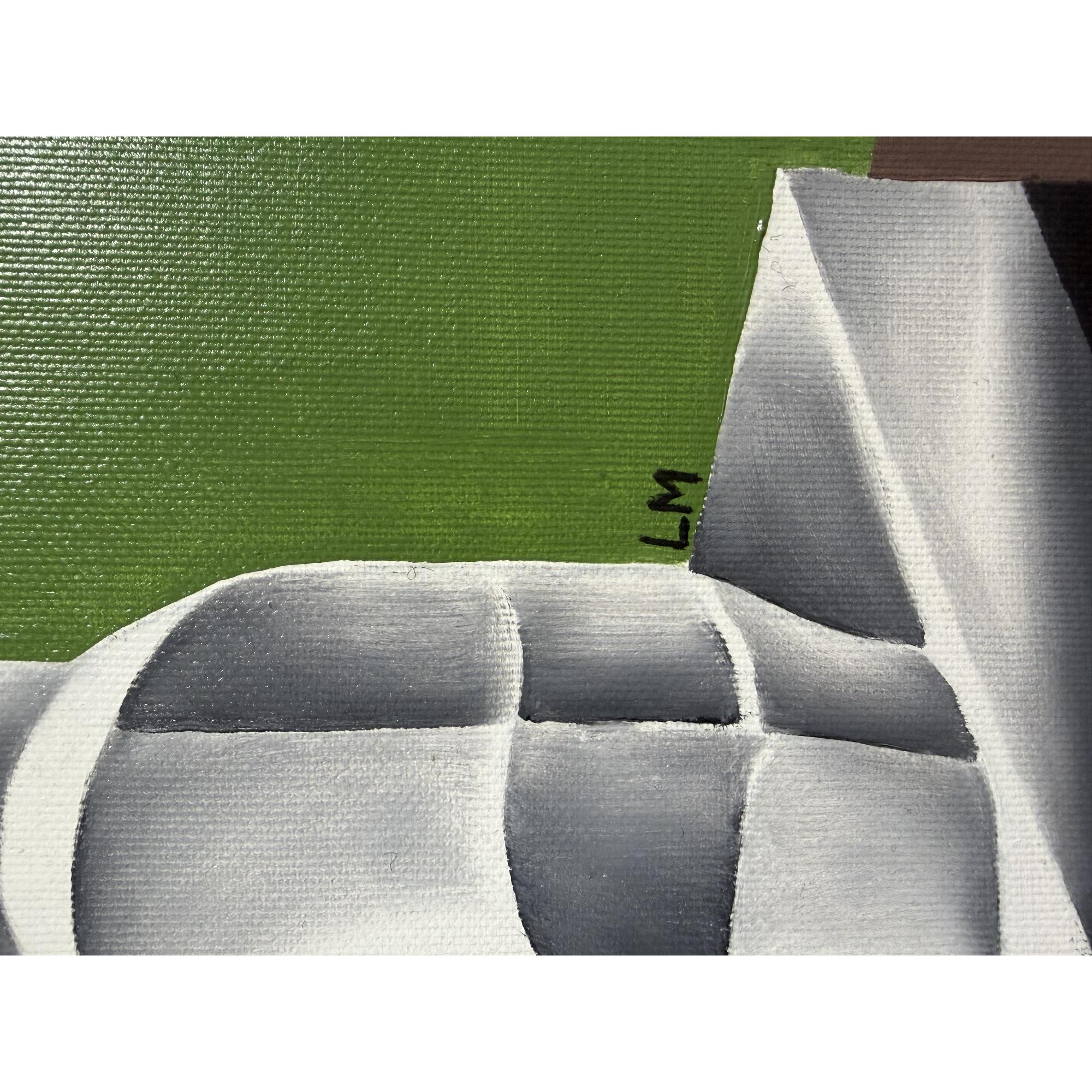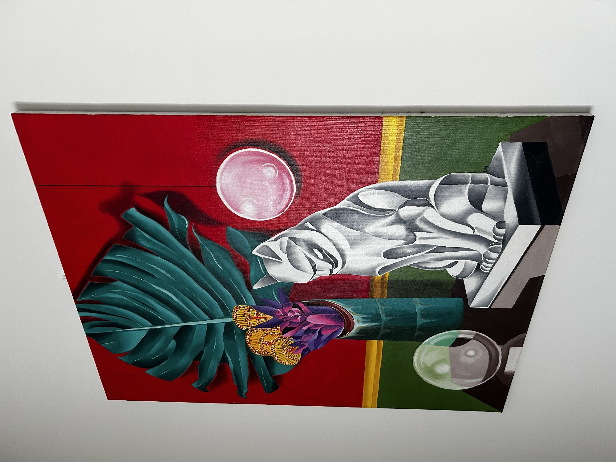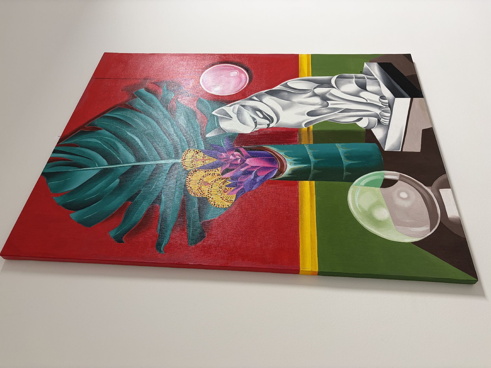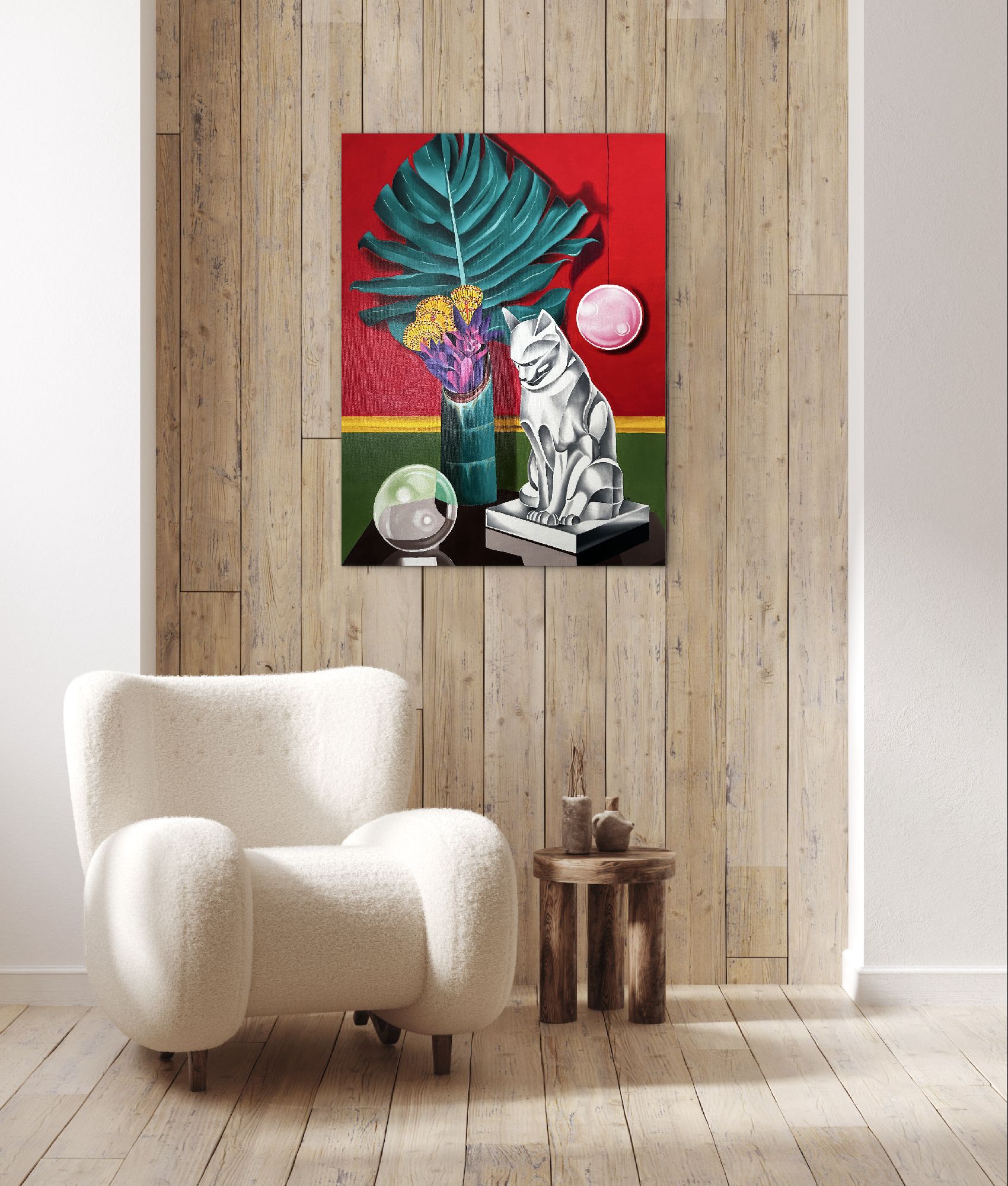Questo dipinto vibrante e surreale presenta una natura morta accuratamente realizzata con una tavolozza di colori audaci.A dominare la composizione è una grande foglia stilizzata di monstera verde, su uno sfondo rosso acceso con un bordo giallo-verde.Un alto vaso nei toni del verde acqua contiene un mix di succulente viola acceso e intricati fiori gialli circolari.Sulla destra, un'elegante scultura geometrica di un gatto, realizzata nei toni del grigio e del bianco, è posta su un piedistallo, emanando un'atmosfera moderna, quasi art déco.Sopra il gatto fluttua una sfera rosa brillante, mentre una sfera di vetro, che riflette i colori circostanti, poggia su un tavolo scuro sottostante.L'effetto complessivo è al tempo stesso elegante ed enigmatico, fondendo elementi di natura, arte e astrazione in una sorprendente armonia visiva.